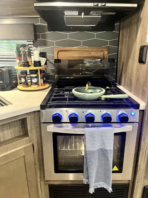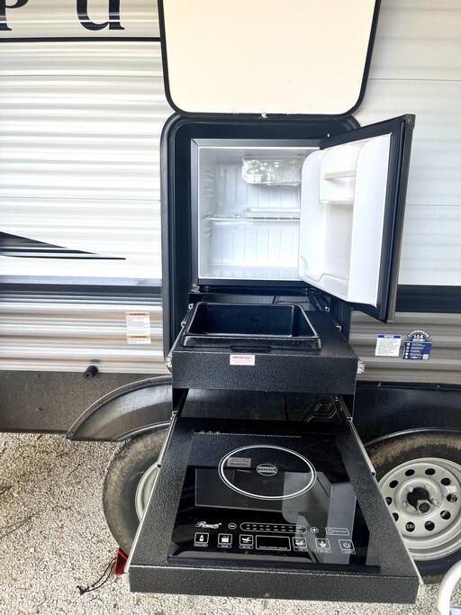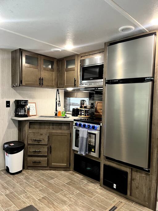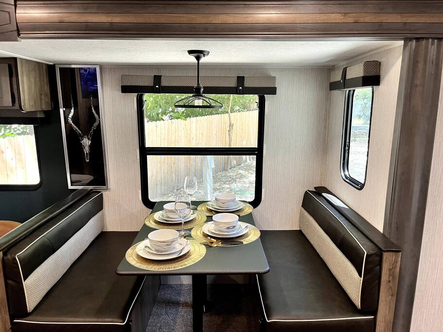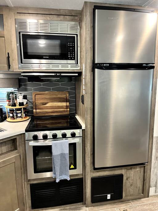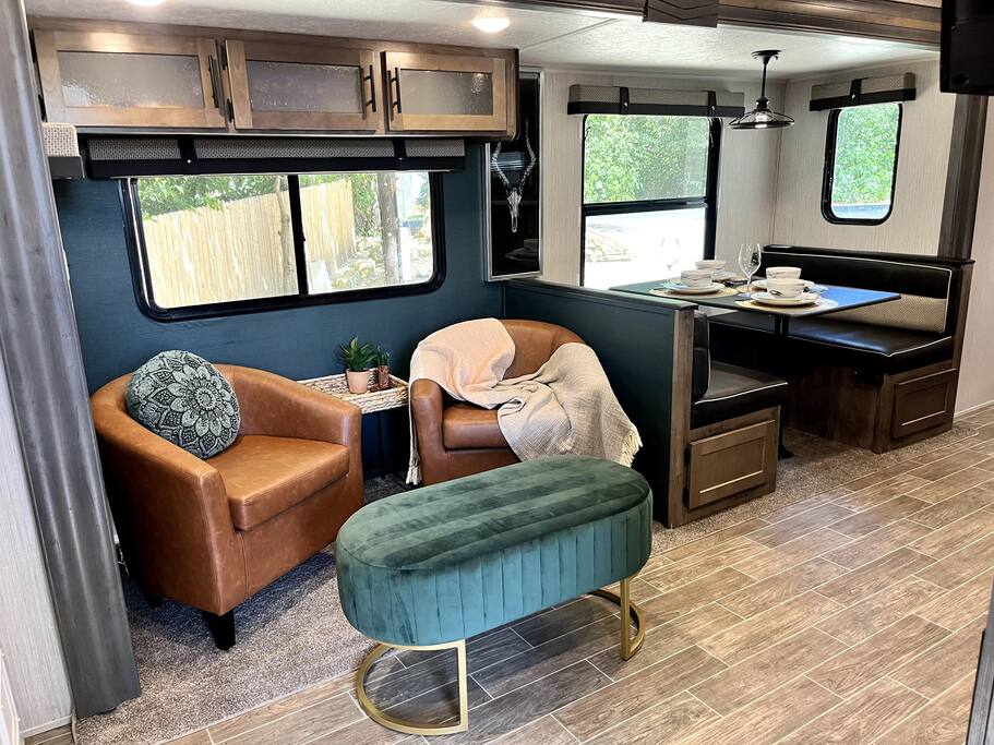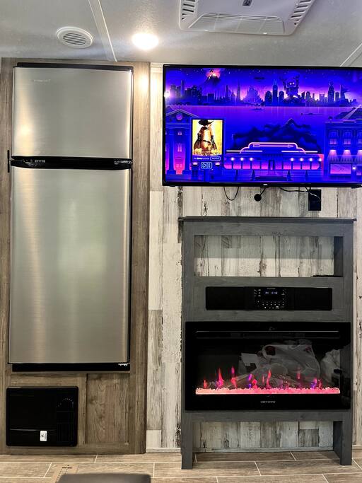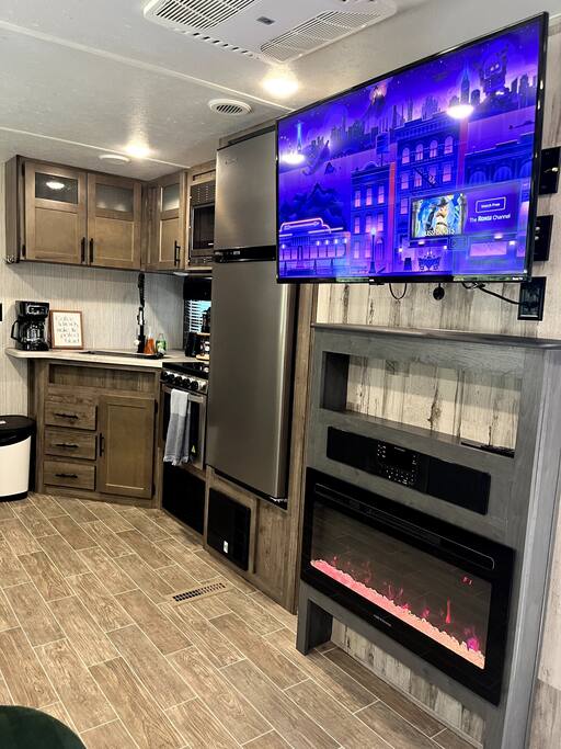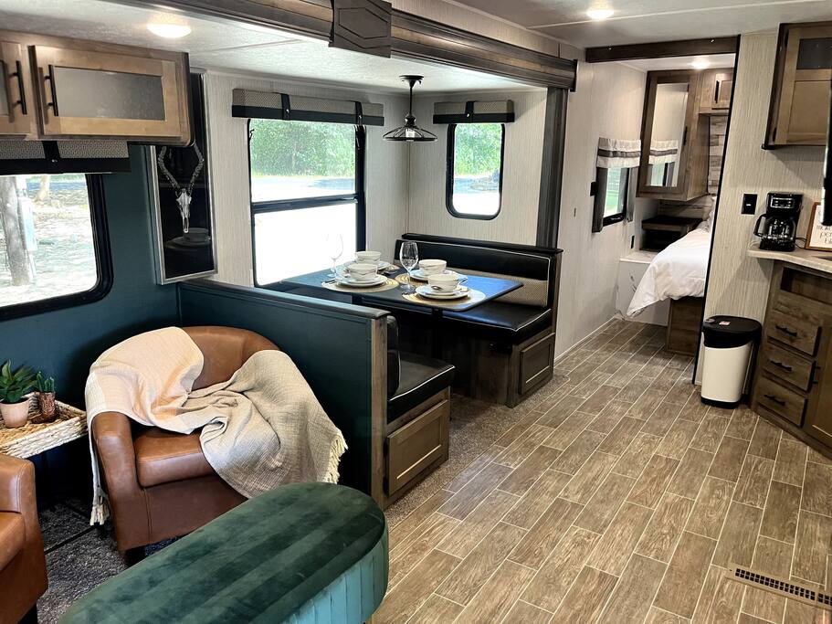 The cozy trailer has a queen bed in the main bedroom and the dinette collapses into a twin bed for a third traveler. The trailer has all of the essential amenities, plus a few extras you might enjoy during your stay! Cool off after a long day in the wonderfully strong A/C or warm up in the winter next to the electric fireplace or turn on the toasty heat!