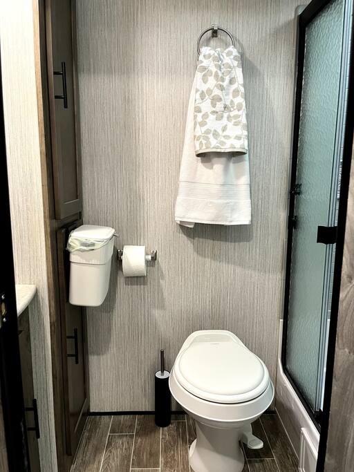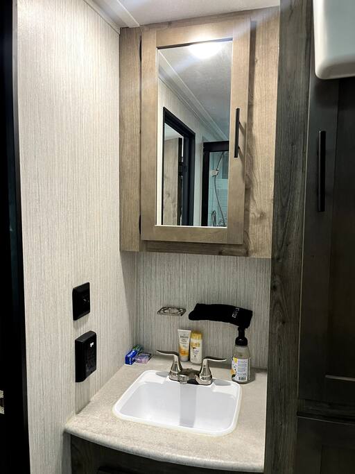 The travel trailer has its own bathroom with a step-in shower and plenty of space to store your hygienic items.