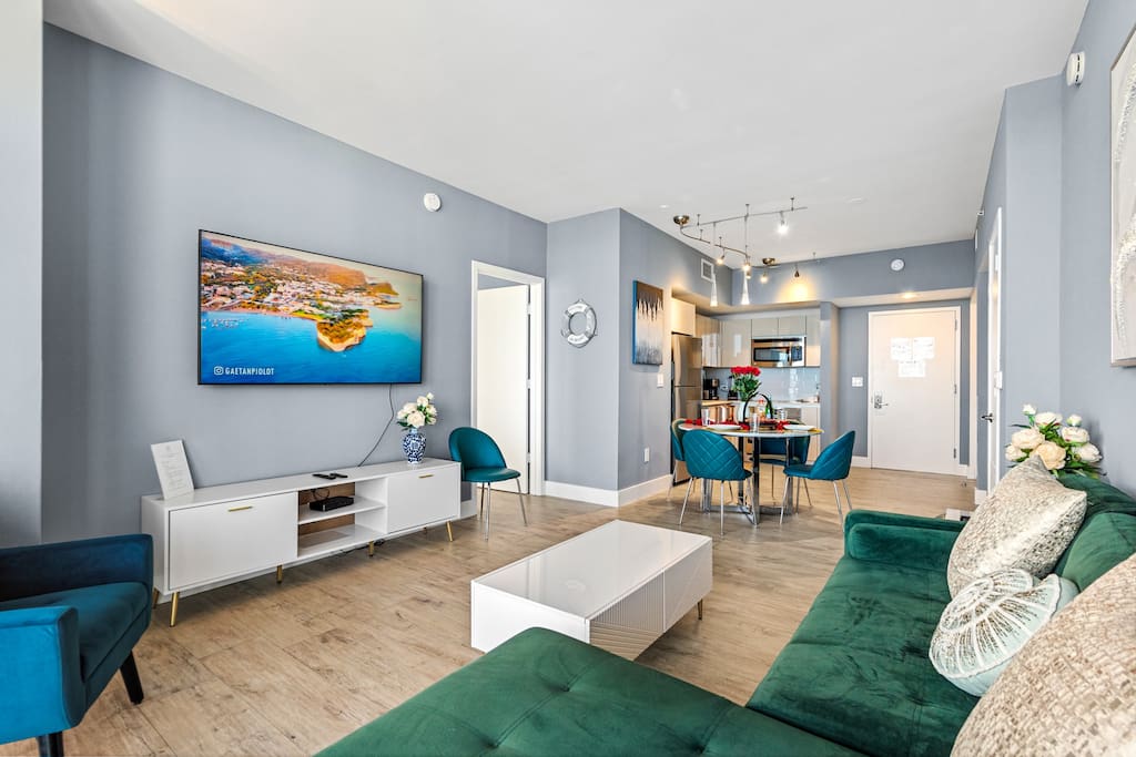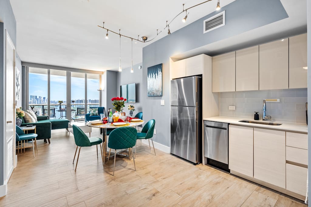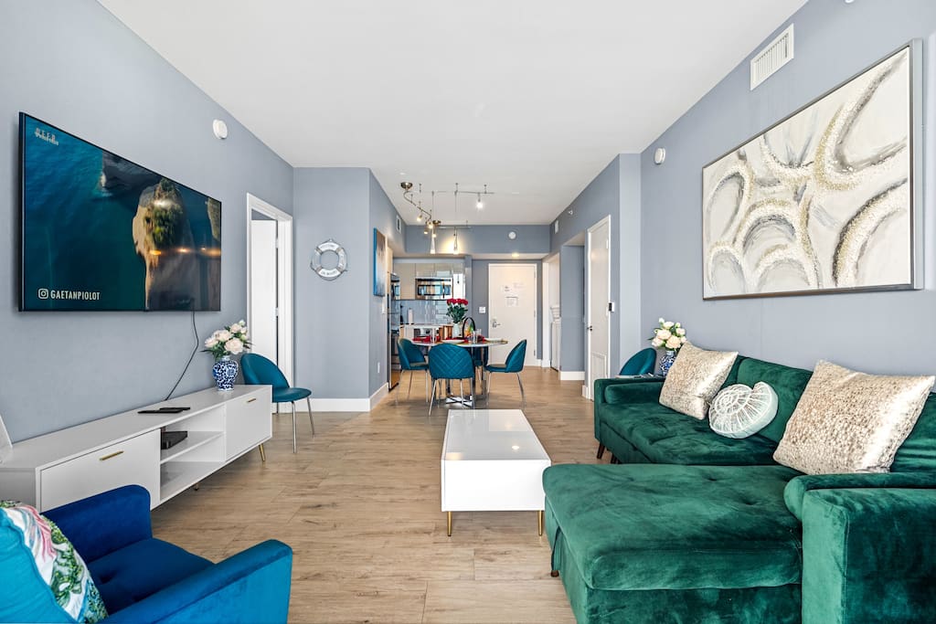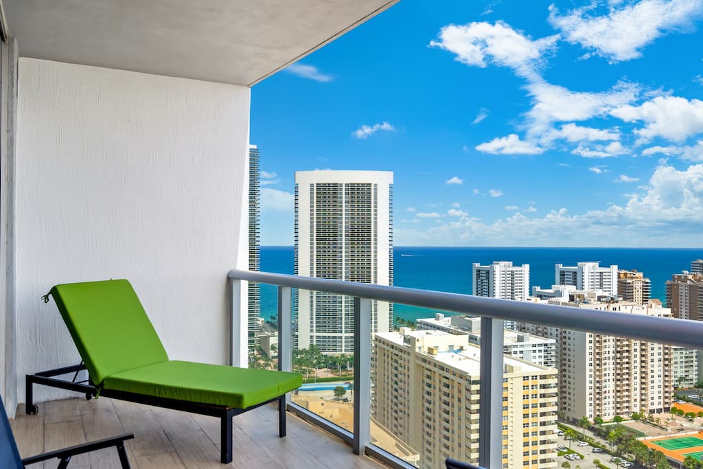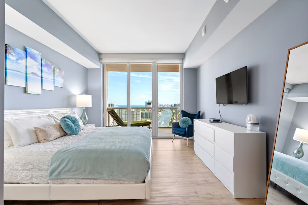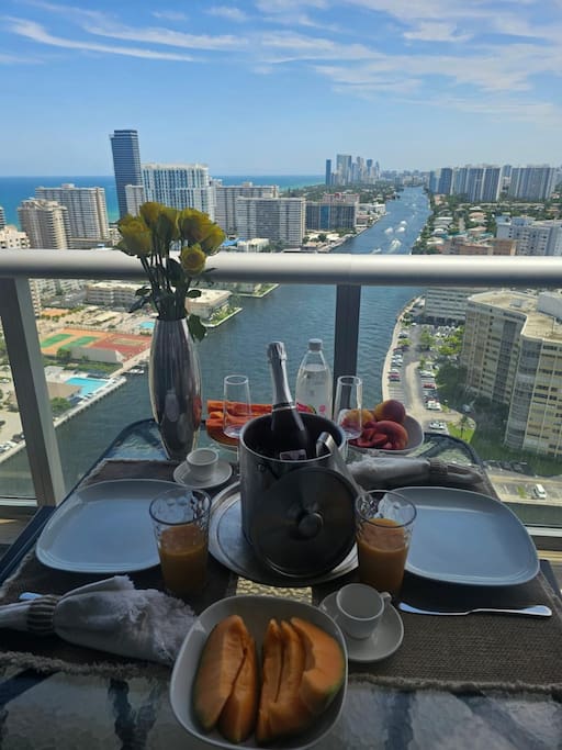 Hallandale Hideaway is more than just a vacation rental; it's a luxurious retreat where every detail caters to your comfort and enjoyment. Enjoy breathtaking views of the Intracoastal Waterway from our balcony, and the downtown skyline. Close to the beach with a free shuttle for easy access. Access to a luxurious heated pool year-round, as well as a state-of-the-art fitness center. We are pet-friendly, too! Complete with Smart TVs to unwind, and cook in our fully stocked kitchen.
