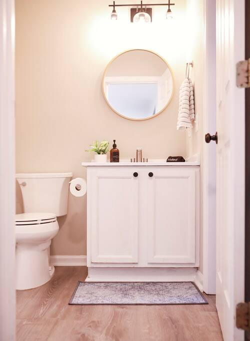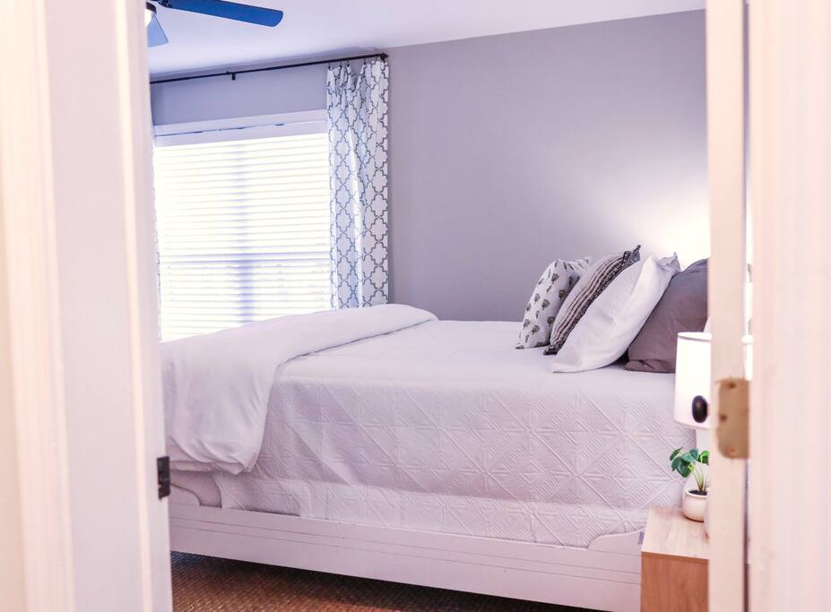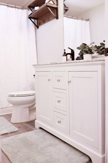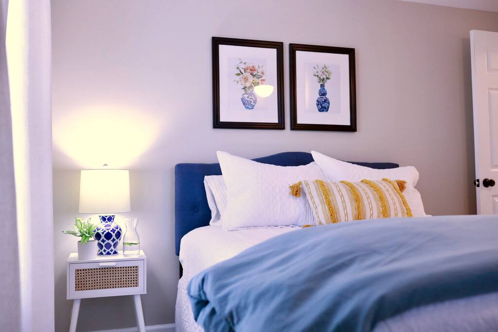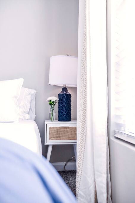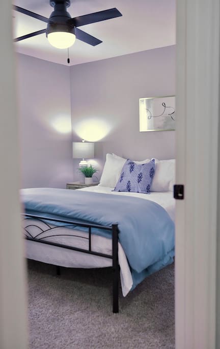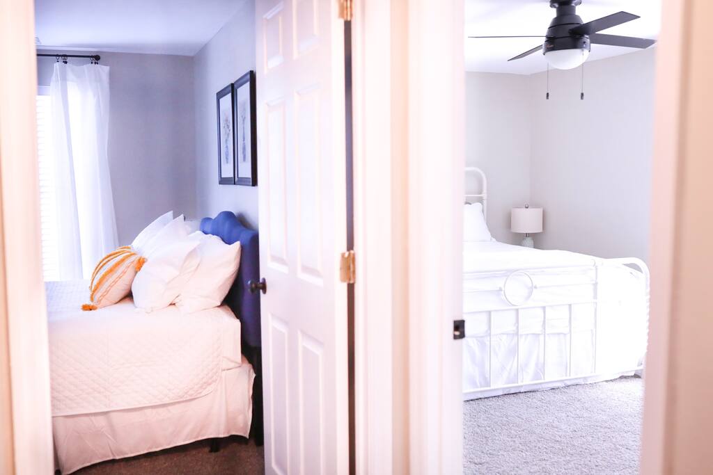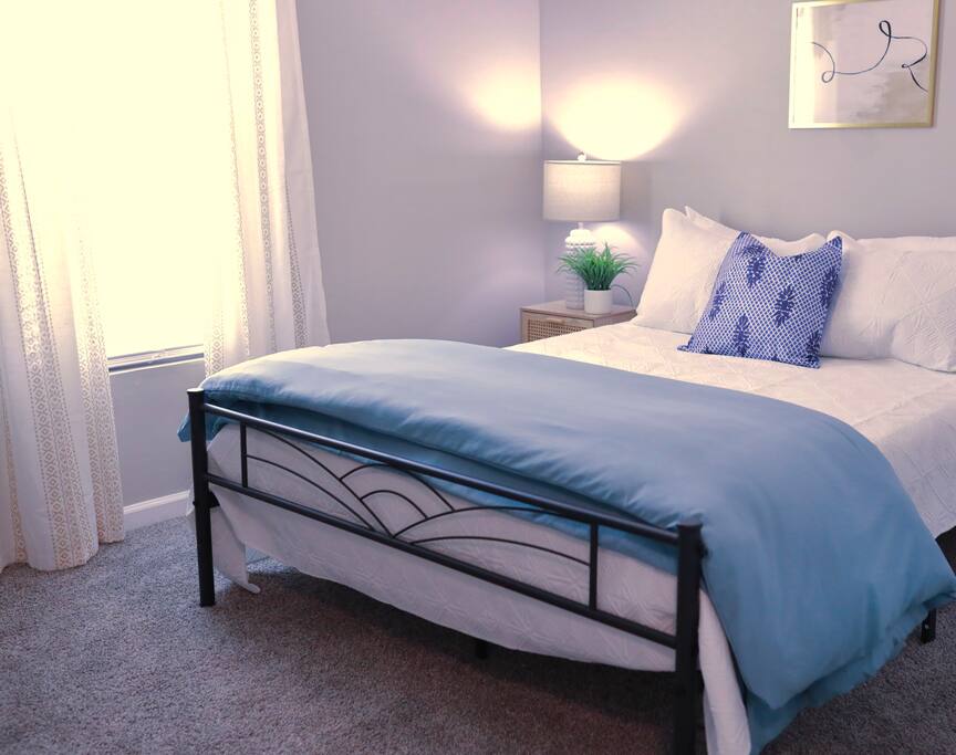 The 5 bedrooms (1 king downstairs, 1 king and 3 queens upstairs) are tastefully decorated, each featuring comfortable beds ensuring a good night's sleep after a day of exploring the nearby attractions. The two bathrooms (1 downstairs & 1 upstairs) are conveniently located, one on each floor to serve all guests, equipped with amenities and fresh towels.