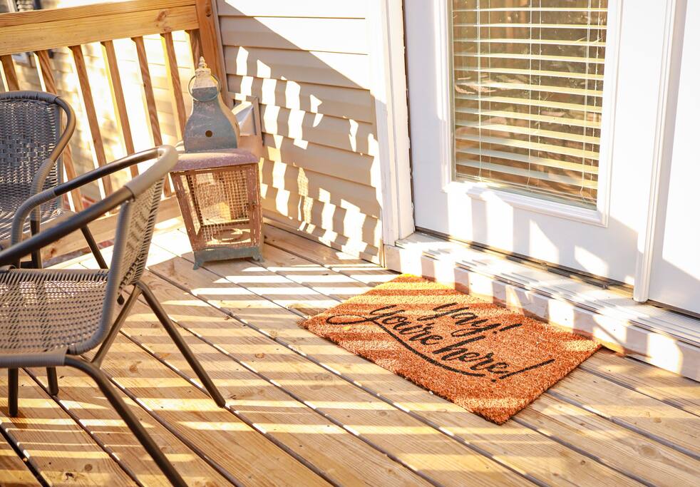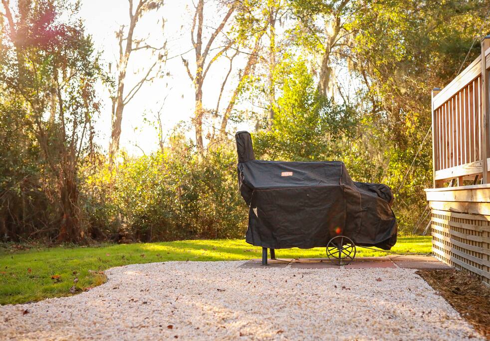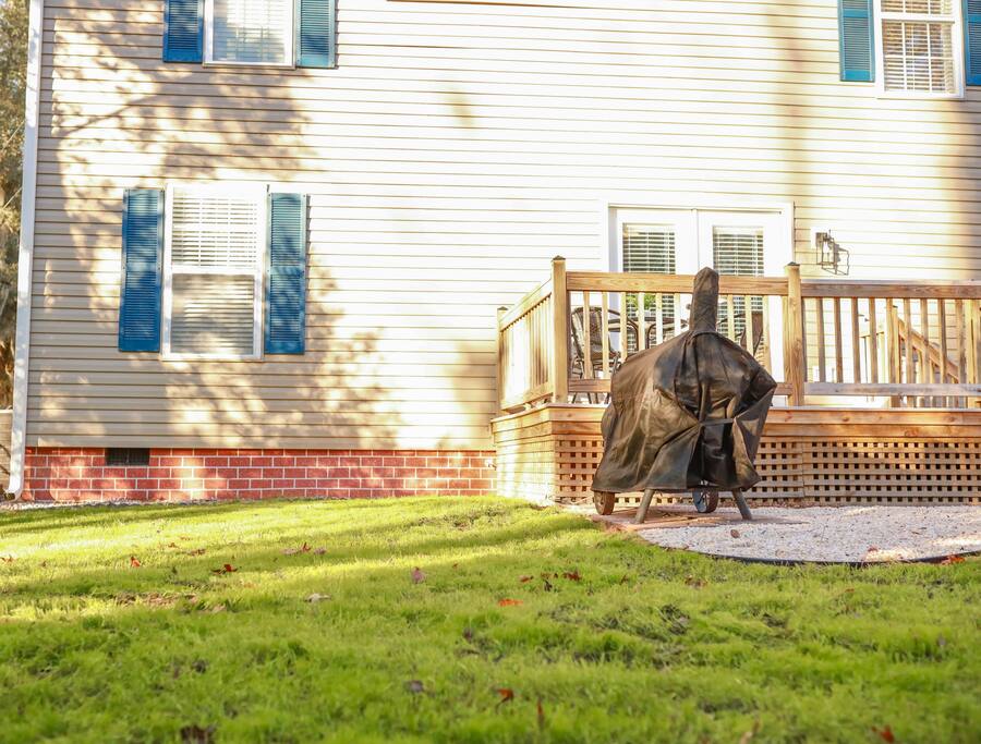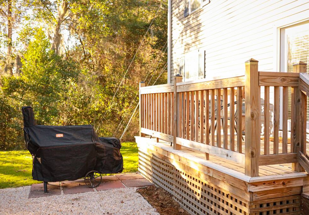 The back porch provides a place to unwind and soak in the pleasant coastal weather while enjoying the barbecue grill on the patio.
