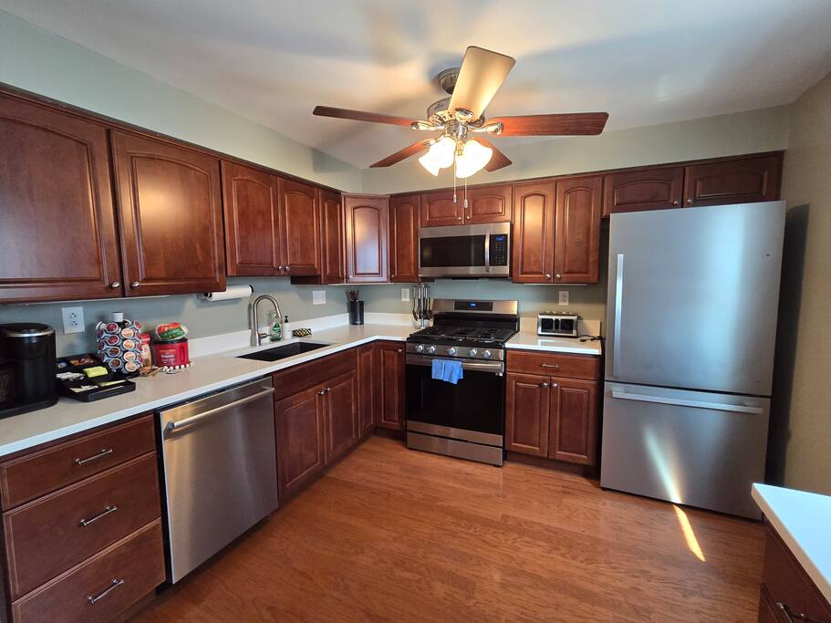 Step into a warm and inviting kitchen, where rich wooden cabinetry, sleek white countertops, and stainless steel appliances create the perfect balance of style and function. Thoughtfully stocked with all the essentials, this space makes cooking a breeze. Under-cabinet lighting adds a cozy touch, while the open layout seamlessly connects to the eat-in dining area—perfect for enjoying a meal while catching your favorite show. With convenient trash and recycling bins, keeping things tidy is effortless. Whether you’re whipping up a feast or enjoying a quiet coffee, this kitchen is designed to make you feel right at home.