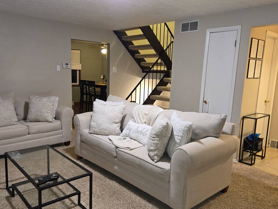 Step into a cozy and spacious living room where comfort meets convenience. Our soft carpet greets you as you settle into the plush sofa and loveseat, perfect for unwinding after a long day. Enjoy your favorite shows and movies on the 65" screen TV, complete with access to Netflix, Amazon Prime, and other streaming apps—just log into your account and start watching. A stylish coffee table keeps your food and drinks within arm’s reach, making relaxation effortless.