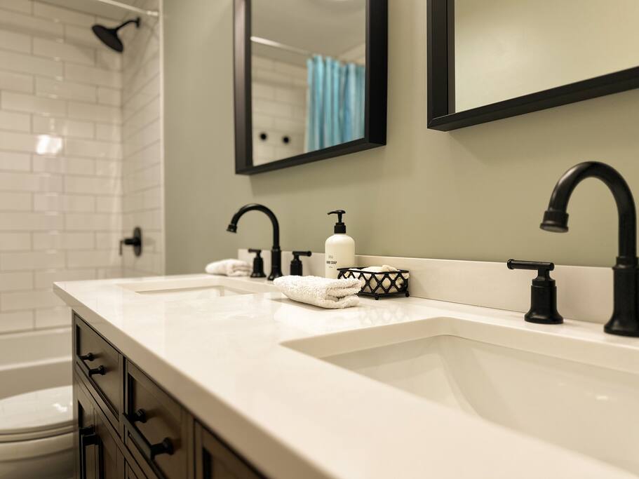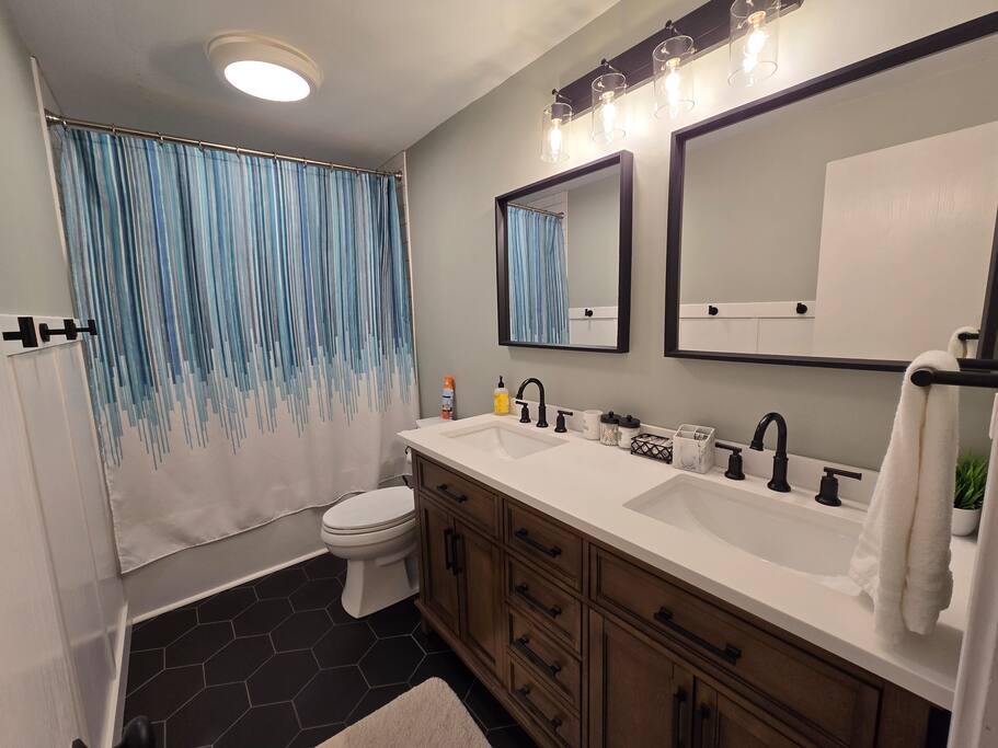 Enjoy the comfort of a newly renovated full bathroom upstairs and a convenient half bath on the main level. The full bath features a deep soaking tub, perfect for relaxing after a long day, along with a spacious double vanity for added convenience. Fresh washcloths, hand towels, bath towels, and complimentary toiletries are provided to enhance your stay.