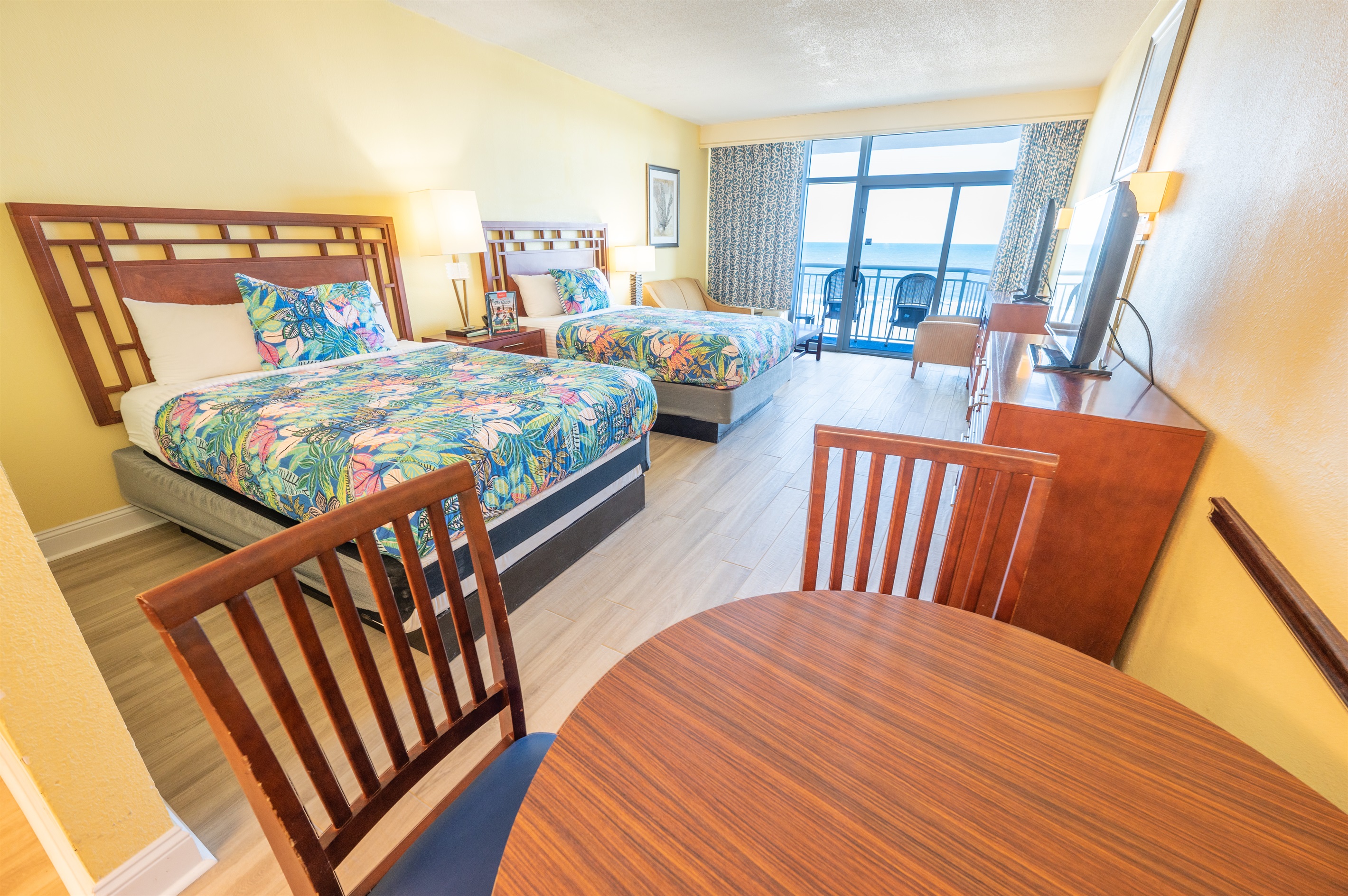 This beachfront condo features 2 Queen Beds, a private bathroom, full-sized appliances, kitchen table. This beachfront condo sleeps 4. Enjoy the morning sunrise on your private direct oceanfront balcony overlooking the beautiful ocean.