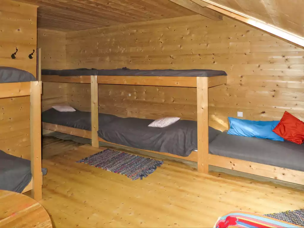 House "Escher", detached. 3.8 km from the centre of Thiéfosse, 42 km from the centre of Épinal, 110 km from the centre of Nancy, in a quiet position on a slope, 6 km from the lake, in the woods. Private: property 350 m2 with meadow. Patio, garden furniture, fireplace. In the house: sauna. Storeroom available. 200 m long bumpy, narrow motor access to the house (via unmade road). Parking (for 5 cars) on the premises. Supermarket 6 km, bus stop "Thiefosse Centre" 4 km. Groups of teenagers on request only. The tap water has no drinking water quality. Important note: Water supply from our own spring. In the event of extreme drought during the season, it may not be possible to guarantee an adequate water supply. In this case, the property will be cancelled by HHD free of charge and any amounts already paid will be refunded. The customer is not entitled to make any further claims in this regard."Escher", 6-room house 150 m2 on 3 levels. Rustic and wooden furniture furnishings: living room, Low door height 170 cm with open-hearth fireplace, Scandinavian wood stove and satellite TV. Kitchen (oven, dishwasher, 4 ceramic glass hob hotplates, toaster, kettle, electric coffee machine). Shower/WC. Upper floor: open dining room with dining table. Exit to the balcony. 1 double bedroom with sloping ceilings. 1 room with sloping ceilings with 1 bed and 1 x 2 bunk beds, 1 double bed. 1 room with sloping ceilings with 1 bed and 3 x 2 bunk beds, 1 double bed. 1 room with sloping ceilings with 2 beds and 1 x 2 bunk beds. Shower/WC. 2nd upper floor: 1 double bedroom. Electric heating, wood heating. Wooden floors. Large balcony. Balcony furniture, deck chairs (6). Facilities: children's high chair, baby cot. Internet (WiFi, free). Please note: non-smoking house. Maximum 3 pets/ dogs allowed.