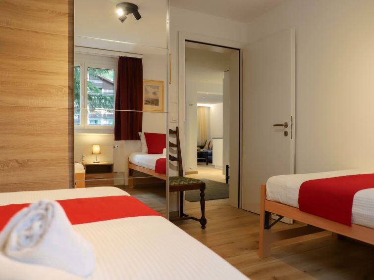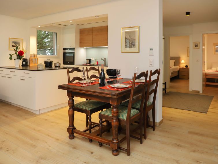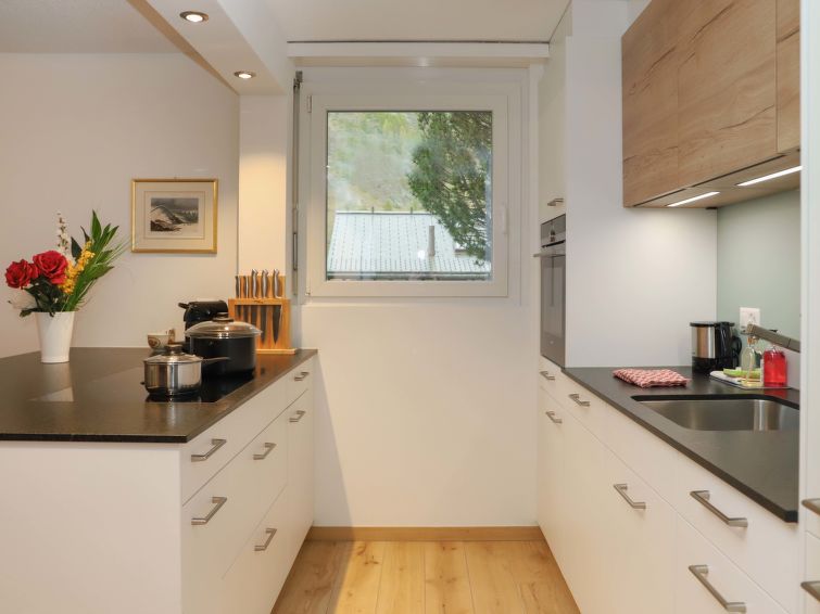 Simple apartment house "Grillon", 4 storeys. In the district of Wiesti 650 m from the centre of Zermatt, in a quiet, elevated position, south facing position. In the house: lift, storage room for skis, central heating system. Stepped path to the house. Supermarket 500 m, restaurant 100 m, bakery 400 m, 10 minute walk to the centre, bus stop "Wiestibrücke" 260 m, railway station "Bahnhof Zermatt" 650 m. Mountain railway 350 m, ski rental 350 m, ski bus stop, ski school 750 m, children's ski school. Cabs cannot stop right in front of the house. The keys‘ handover takes place by the agency Interhome in Zermatt."Grillon", 3-room apartment 90 m2, on the ground floor, south facing position. Bright, fully renovated in 2022, beautiful and modern furnishings: open living/dining room with dining table and TV. Exit to the balcony, south facing position. 1 double bedroom with 1 double bed (1 x 180 cm, length 200 cm). 1 room with 2 beds (90 cm, length 200 cm). Open kitchen (oven, dishwasher, 4 induction hot plates, toaster, kettle, freezer, electric coffee machine, cooking island). Shower/WC, double hand-basin. Parquet floors. Balcony, south facing position. Balcony furniture. Side view of the Matterhorn. Facilities: hair dryer. Internet (WiFi, free). Please note: non-smokers only.