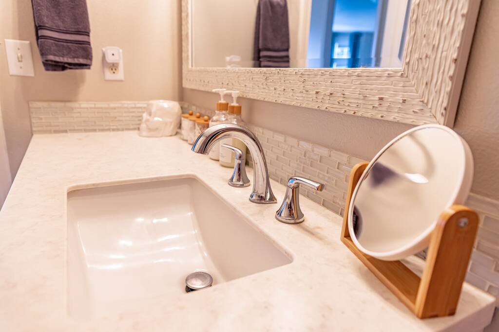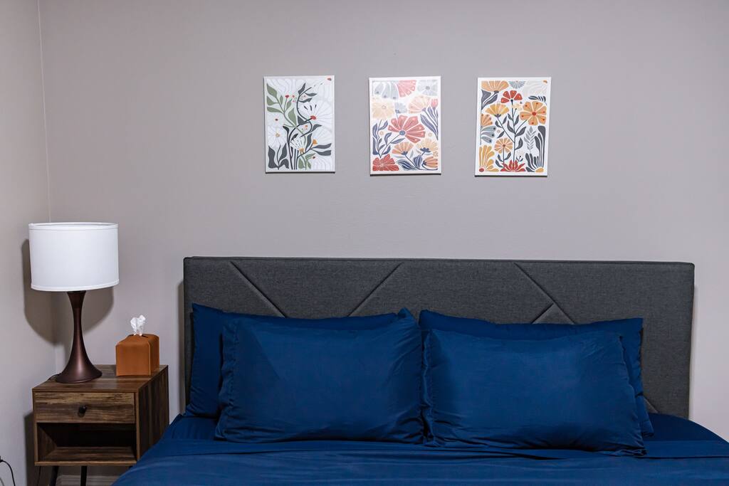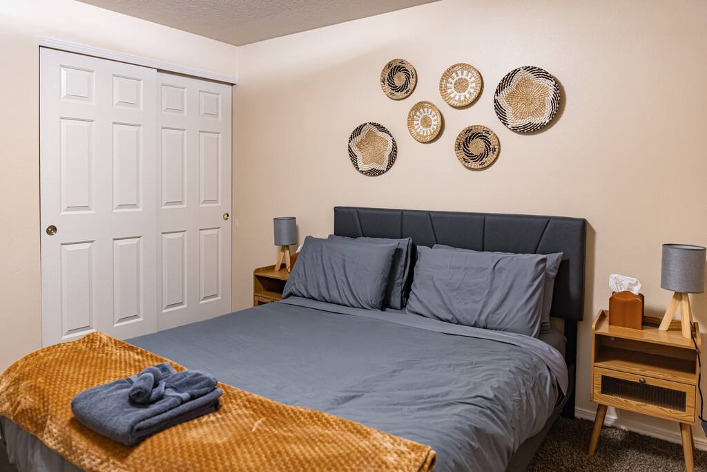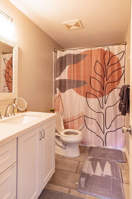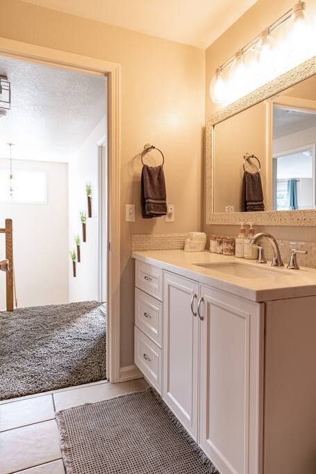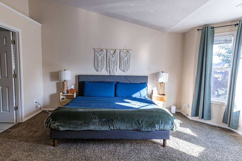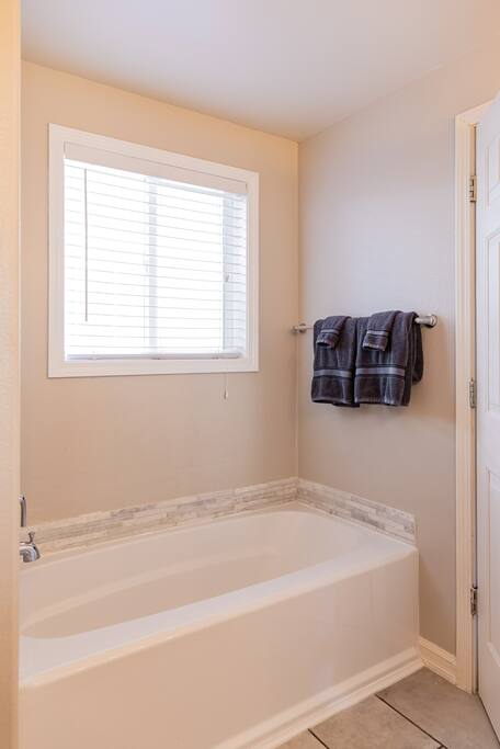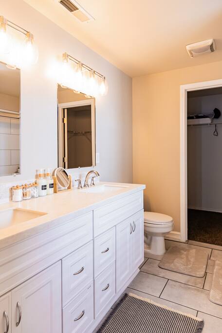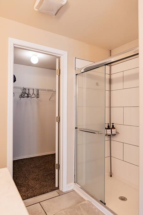 Experience comfort and convenience in our inviting master suite, featuring a luxurious bathtub, a spacious walk-in shower, dual sinks, and a large walk-in closet. Enjoy peace of mind with exterior security cameras and free on-site parking for your stay.