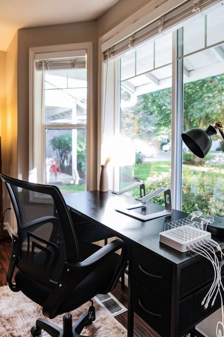 For remote workers, the dedicated workspace includes a comfortable desk with drawers, a laptop stand, ergonomic chair, and charging station.