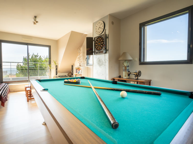 Large, beautiful single-family house "Hidel". In the district of Ruscumunoc 4.5 km from the centre of Plouarzel, 4 km from the centre of Lampaul-Plouarzel, 14 km from the centre of St. Renan, in a quiet position residential area (villas), 300 m from the sea, 300 m from the beach, in a cul-de-sac. Private: property 1'000 m2 (fenced), garden with lawn and wildlife garden. In the house: billiard table, table football. Parking (for 3 cars) on the premises. Shop 4 km, supermarket 4.5 km, bakery 4.5 km, bus stop "Plouarzel Centre" 4.8 km, sandy beach "Plage de Ruscumunoc" 300 m. Sports harbour 15 km, golf course (18 hole) 8 km, indoor tennis centre 4.5 km, walking paths from the house 300 m. Nearby attractions: Aber Ildut 15 km, Parc d'attraction La Récré des 3 Curés 25 km. The owner does not accept any groups."Hidel", 5-room house 170 m2 on 2 levels. Spacious and bright, modern and tasteful furnishings: living/dining room, on 2 levels with Scandinavian wood stove, dining table, satellite TV, international TV channels, radio, CD-player and DVD. Exit to the terrace. 1 room with 1 french bed (160 cm, length 200 cm), shower. Open kitchen (oven, dishwasher, Gas stove, 6 gas rings, toaster, kettle, microwave, freezer, electric coffee machine, raclette grill, fondue Set (cheese)). Exit to the terrace. Sep. WC. Upper floor: 1 room with sloping ceilings with 1 french bed (140 cm, length 190 cm). 1 room with sloping ceilings with 2 beds (90 cm, length 190 cm). 1 room with sloping ceilings with 1 french bed (160 cm, length 200 cm), 1 pull-out bed (2 x 90 cm, length 190 cm). Bath/WC, double hand-basin. Electric heating. Balcony, terrace 75 m2, south-west facing position. Terrace furniture, barbecue (portable), box-room. View of the sea. Facilities: washing machine, dryer, iron, children's high chair, baby cot, hair dryer. Internet (WiFi, free). Please note: non-smoking house. Maximum 1 pet/ dog allowed. Smoke alarm.