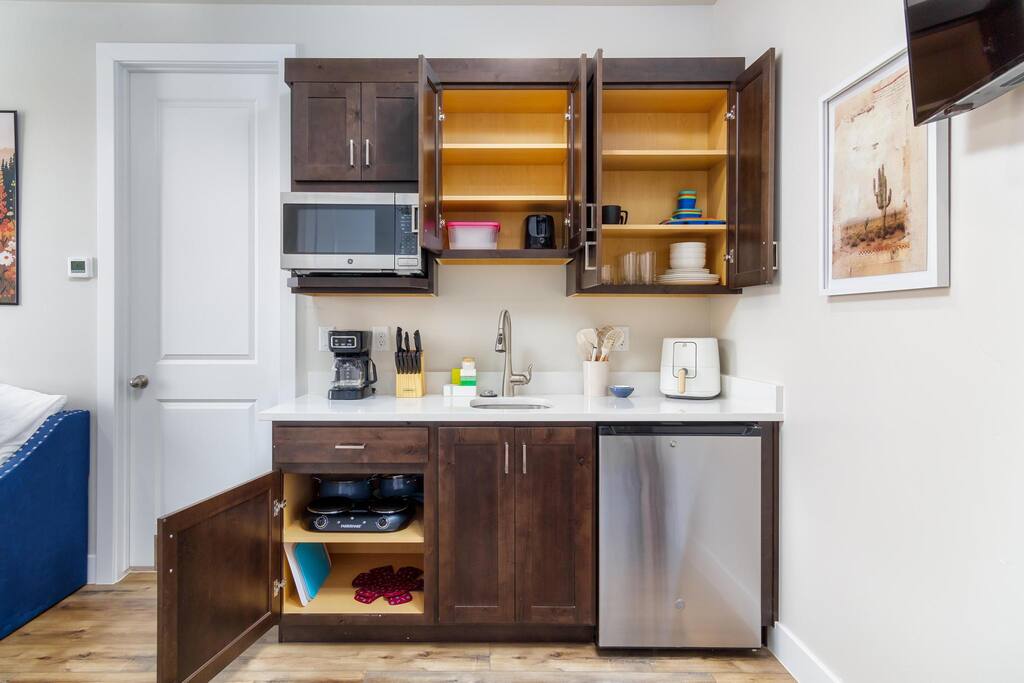 • Kitchenette: Fully equipped with an air fryer, toaster, drip coffee maker, mini fridge with a freezer compartment for ice trays, two-burner hot plate, and all necessary cookware and dinnerware.