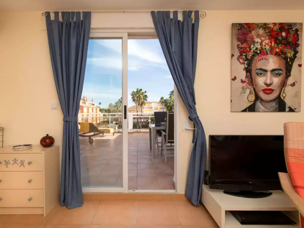 Large, beautiful, comfortable apartment block "Jardines de Denia I", 2 storeys. In the resort 2.5 km from the centre of Dénia, in a quiet, sunny position, 300 m from the sea, from the beach. For shared use: property (fenced) with lawn and trees, swimming pool (15 x 20 m, 35 m diameter, depth 120 - 180 cm, seasonal availability: 01.Jan. - 31.Dec. pool opening hours: 09:00-15:30 and 17:30-24:00). Unconventional pool shape. Shower/WC in the pool area, children's pool, parking on the premises. Shop 70 m, supermarket 80 m, restaurant 60 m, café 80 m, bus stop 300 m, railway station 3.3 km, ferry 2.7 km, sandy beach 250 m. Sports harbour 2.5 km, marina 2.5 km, surf school, sailing school 400 m, tennis 1 km."Jardines de Denia I", 3-room apartment 76 m2 on 2 levels. Simple and cosy furnishings: living/dining room with digital TV, air conditioning and forced-air heating. Exit to the terrace with 1 bed (90 cm, length 180 cm), 1 x 2 bunk beds (90 cm, length 180 cm). Open kitchen (oven, dishwasher, 4 ceramic glass hob hotplates, toaster, kettle, microwave, freezer, electric coffee machine). Shower/WC. On the lower ground floor: 1 room with 2 beds (90 cm, length 200 cm), air conditioning and forced-air heating. Exit to the terrace. Bath/WC. Large terrace 25 m2, large terrace 20 m2. Very beautiful view of the swimming pool, the countryside and the resort. Facilities: washing machine, iron, children's high chair, baby cot, hair dryer. Internet (WiFi, free). Parking. Please note: TV only ES. VT-487298-A