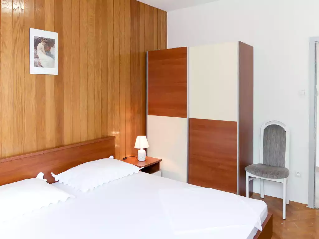 Marušići 14 km from Omiš: Apartment house "Lada". 20 km from the centre of Makarska, on a slope, 100 m from the sea, 100 m from the beach, in a cul-de-sac. For shared use: property 500 m2, swimming pool angular (7 x 5 m, depth 150 cm, seasonal availability: 20.May. - 14.Oct.) with internal staircase. Outdoor shower. In the house: internet access. 100 m long steep motor access to the house. Stepped path to the house. Parking at the house. Shop 200 m, supermarket 14 km, bus stop 1.8 km, pebble beach 100 m. Please note: airfield 56 km from the property. Property ref. HR5020.641.1 is situated on the same property."Lada", 3-room apartment 75 m2 on 2nd floor. Living/dining room with 1 double sofabed (150 cm), TV (flat screen), air conditioning. Exit to the balcony. 1 room with 1 double bed. 1 room with 1 double bed (160 cm). Open kitchen (oven, dishwasher, 4 ceramic glass hob hotplates, toaster, kettle, freezer, electric coffee machine). Shower/WC, sep. WC. No heating option. Balcony. Balcony furniture. Marvellous view of the sea. Facilities: Internet (WiFi, free). Please note: private entrance.