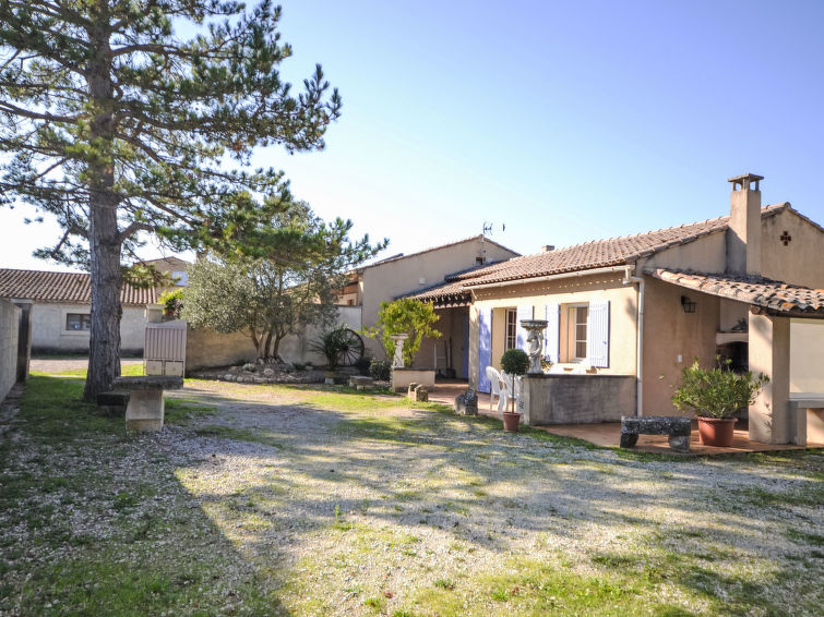 Small resort, surrounded by meadows and fields. 4 apartments in the residence. 1 km from the centre of Velleron, 4 km from the centre of L'Isle-sur-la-Sorgue, 15 km from the centre of Avignon. For shared use: property with lawn and plants, swimming pool (10 x 5 m, depth 140 - 200 cm, seasonal availability: 15.Apr. - 15.Oct.). Parking on the premises. Shop 1 km, supermarket 4 km, bus stop "Charles de Gaulle" 850 m. Please note: the owner lives on the same property."Le Real", 3-room house 65 m2. Practical and rustic furnishings: living/dining room with open-hearth fireplace (only for decoration), dining table and TV. Exit to the terrace. 1 room with 2 beds. 1 room with 1 french bed. Kitchen (oven, dishwasher, 4 gas rings, toaster, kettle, microwave, electric coffee machine). Bath/WC. Electric heating. Terrace partly roofed, garden 300 m2. Terrace furniture, barbecue. Facilities: washing machine. Internet (WiFi, free). Please note: non-smokers only.