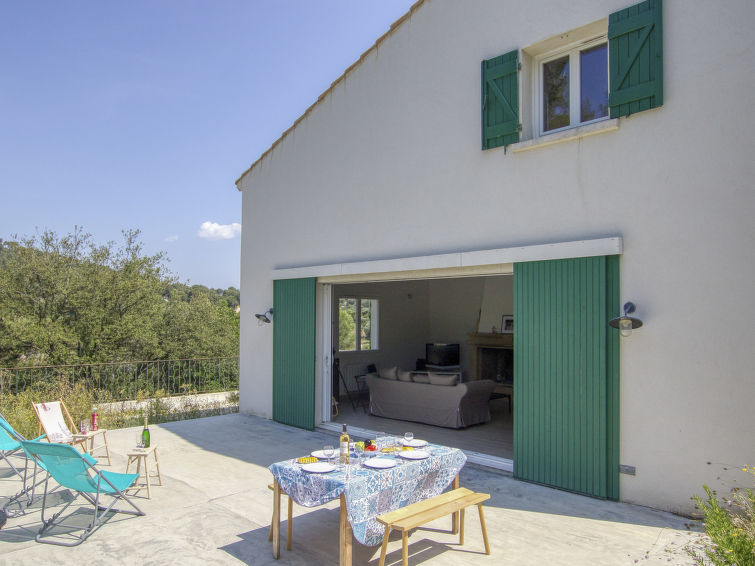 La Cadière d'Azur: Ca parking on the ground for only one car. Old, small, beautiful single-family house "Les Vignes", surrounded by fields and vineyards. In an elevated position on a slope, 3 km from the sea. Private: garden 600 m2 (not fenced). Bumpy, narrow motor access to the house. Parking on the premises. Shop 3 km, grocery 3 km, bus stop "chemin des Baumes" 2.9 km, railway station "Saint Cyr les Lecques-La Cadière" 3.8 km, sandy beach 3 km. Golf course (18 hole) 5 km, riding stable 2 km. Nearby attractions: Aqualand 5 km. Hiking paths: Sainte Baume, Sainte Victoire, Calanques Port-Cros, Porquerolles, Ile verte, Embiez, Figuerolles, Cassis. Please note: car recommended. The keys‘ handover takes place by the agency Interhome in Saint Cyr Sur Mer, 5 km.3-room house 70 m2 on 2 levels. Antique furnishings: living/dining room with TV, radio, CD-player and DVD. Small, open kitchen (2 hot plates, mini-oven, toaster, kettle, microwave, freezer, electric coffee machine). Upper floor: (open staircase), 1 room with 1 french bed (140 cm, length 190 cm). 1 room with 1 french bed (140 cm, length 190 cm). Shower/WC. Electric heating. Terrace 30 m2, south-west facing position. Terrace furniture, electric barbecue. Marvellous panoramic view of the sea and the countryside. Facilities: iron. Internet (WiFi, extra). Please note: maximum 1 small pet/ dog allowed. TV only FR. Smoke alarm.