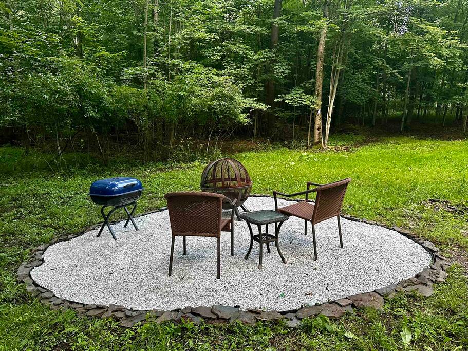 Unwind on the outdoor deck, surrounded by tall trees and the soothing sounds of nature. It's the ideal spot to enjoy your morning coffee or relax with a good book. As the sun sets, gather around the fire pit for s'mores and storytelling under the starlit sky - a truly magical experience.