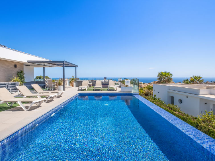 Cumbre del Sol: Very modern, beautiful villa "Megin", 2 storeys, built in 2014. In the district of Cumbre del Sol 5.5 km from the centre of Moraira, in a quiet, sunny position, 2 km from the sea, 2 km from the beach. Private: property 800 m2 (fenced), garden, swimming pool angular (4 x 8 m, depth 150 - 200 cm, seasonal availability: 01.Jan. - 31.Dec.) with internal staircase. In the house: air conditioning. Parking on the premises. Shop 3 km, supermarket 3 km, restaurant 3 km, bus stop "Benitachell" 5.1 km, railway station "Teulada" 8.7 km, ferry "Denia" 24.3 km, pebble beach "Cala Moraig" 2 km. The owner does not accept any groups. The owner does not accept any youth groups. Neighbourhood highly sensitive to noise. Quietness and good behaviour expected."Megin", 7-room villa 250 m2 on 2 levels. Spacious and bright, very modern and stylish furnishings: large living/dining room 100 m2. Exit to the terrace, to the swimming pool. 1 double bedroom with 2 beds (90 cm, length 200 cm), bath/shower/bidet/WC and double hand-basin. Exit to the terrace, to the swimming pool. Open kitchen (oven, dishwasher, 4 induction hot plates, freezer, electric coffee machine). Sep. WC. Underfloor heating. On the lower ground floor: living/dining room with satellite TV and flat screen. Exit to the terrace. 1 room with 2 beds (90 cm, length 200 cm). 1 double bedroom with 2 beds (90 cm, length 200 cm). Exit to the garden. 1 room with 1 double bed (2 x 90 cm, length 200 cm), shower/WC. Open kitchen (oven, dishwasher, 4 induction hot plates, freezer, electric coffee machine). Shower/WC, double hand-basin. Underfloor heating. Large terrace 130 m2 partly roofed, small terrace. Terrace furniture, barbecue, deck chairs (7). Marvellous panoramic view of the sea and the countryside. Facilities: washing machine, iron, baby cot. Internet (WiFi, free). Parking (2 cars). Please note: suitable for families. Non-smokers only. AT-441013-A // Reg. Nr.: ESFCTU00000303800006711900000000000000000AT-441013-A7