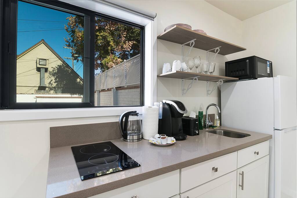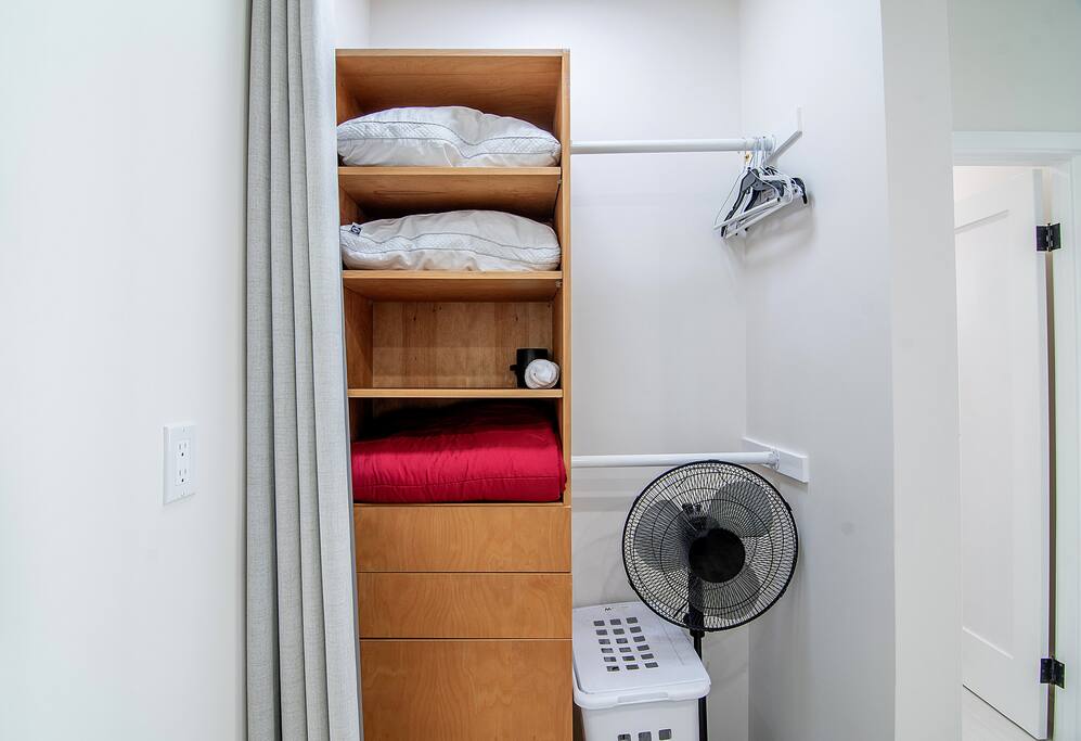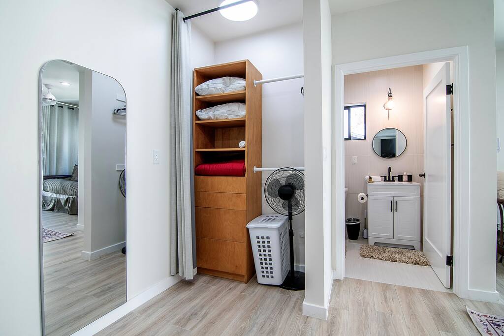 The suite also features modern climate control with a window air conditioning unit and portable heaters for your comfort year-round. The bright, airy design complements the suite’s cozy atmosphere, creating a welcoming space to relax and recharge.