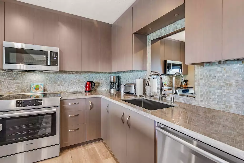 We completed a renovation in October 2018. High-end amenities include: Bosch built-in refrigerator, inductive cooktop and dishwasher, beautiful custom quartzite countertops, built-in bar with wine refrigerator. We've fully enclosed the master bath and replaced the 80's style tub with a luxury shower overlooking the ocean. The cabinets are custom-made grey-stained bamboo. The two king-sized beds are outfitted with luxury Vispring mattresses from the UK. And we have replaced the old sliding doors with Panda doors which have a 10' wide opening on the front lanai. All details have been thoughtfully updated to meet the requirements of the sophisticated traveler.