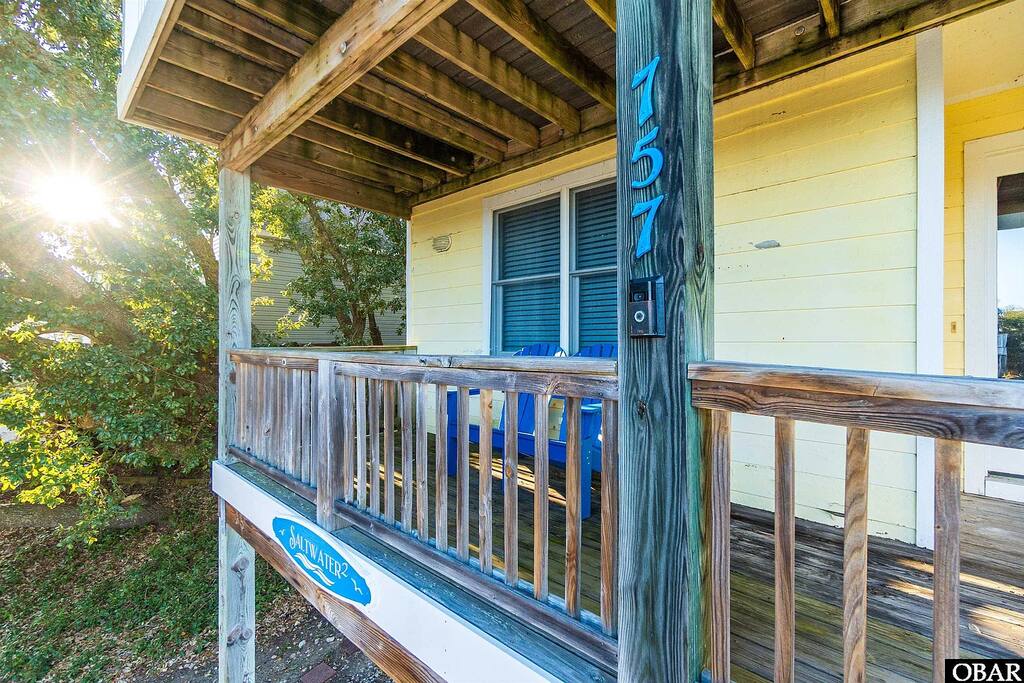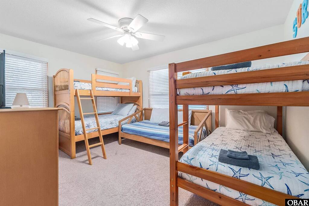 The utility room (including washing machine and dryer) is underneath the house on the ground level. There is an outdoor shower on the ground level next to the utility room. From the ground level, there are stairs on both the front and back of the house. The front steps lead to a deck overlooking the cul-de-sac and front door which opens to the family room. The rear steps lead to a covered deck with seating (off of the great room) and a screened porch (off of the kitchen). Cafe lights are available to plug in on both the covered deck and screened porch. The 1st floor features a family room, dining area, breakfast bar, kitchen, bedroom with queen bed, and bathroom with a shower. The 2nd floor is open to the 1st floor with a family room, 2 bedrooms, and a bathroom. The queen bedroom (on the west side of the house) opens to a private deck off the front of the house and a jack and jill bathroom. The twin bedroom (on the east side of the house) opens to a deck which spans the entire back of the house. The 2nd floor family room is the perfect place for lounging and opens to the rear deck. All mattresses are memory foam.
