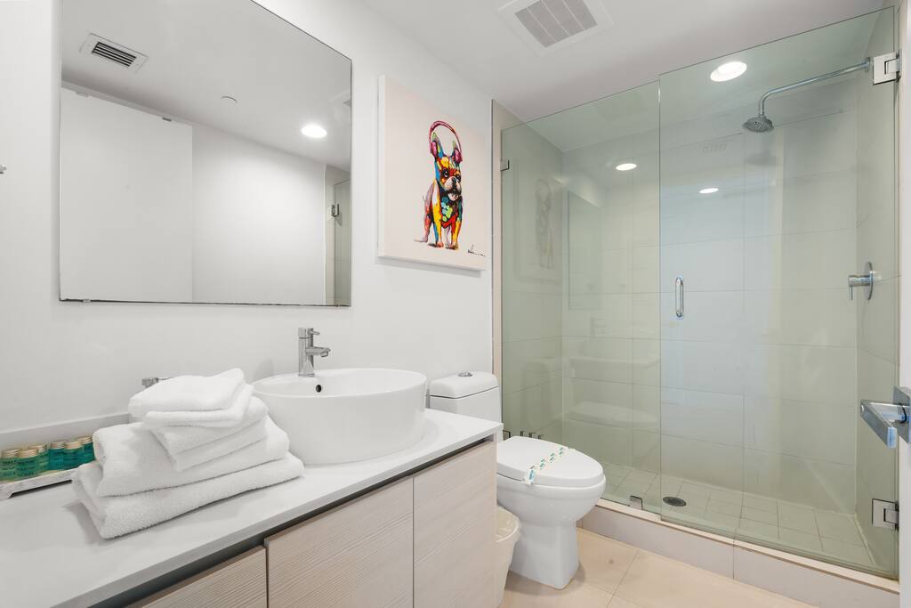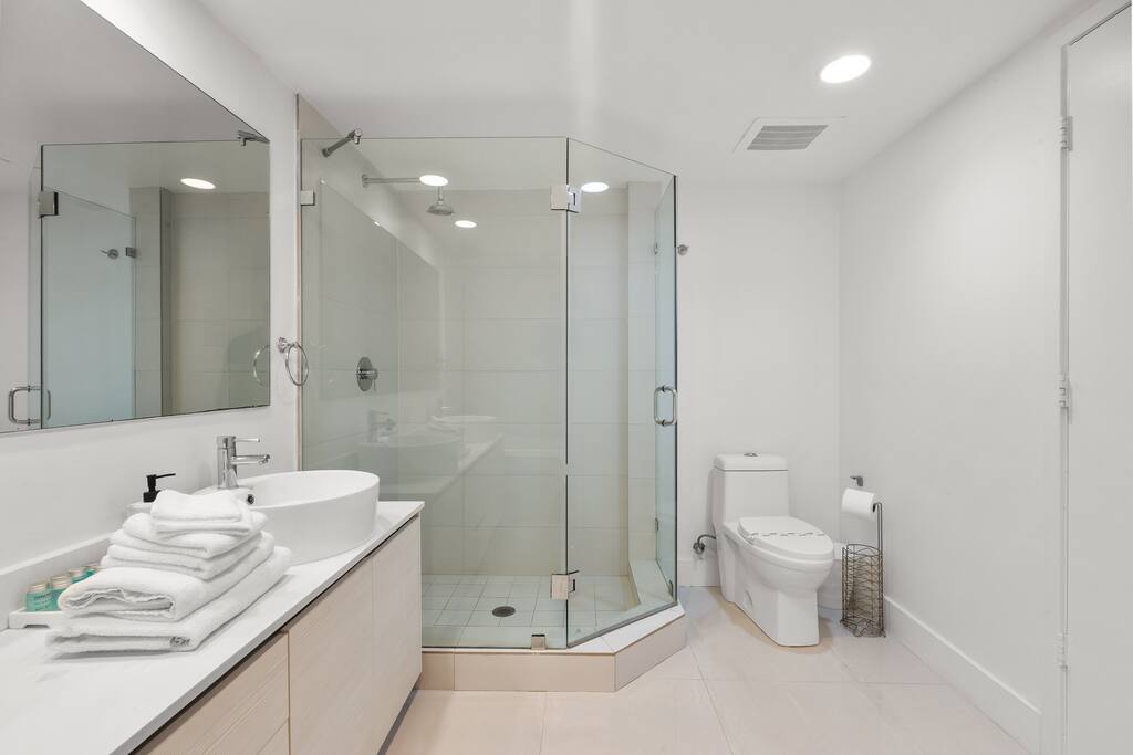 The third bathroom, located just in front of the third bedroom and accessible from the living room, features a modern glass-enclosed shower, stylish vanity, and bright lighting. Its fresh, contemporary design makes it both functional and inviting for guests.
