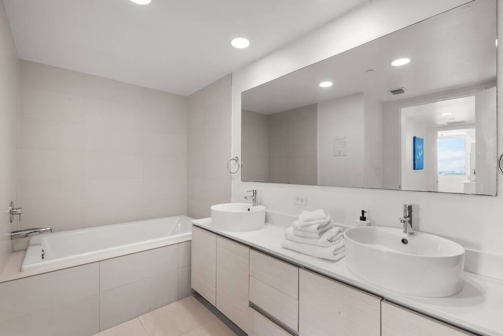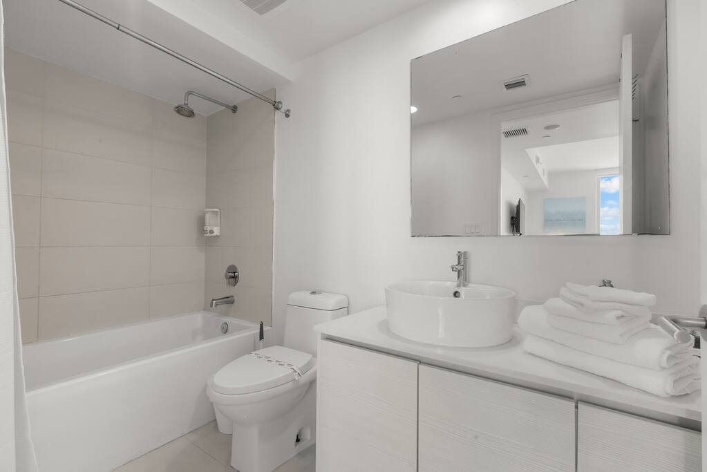 The second bathroom, located in the second bedroom, offers a bright and functional space with a modern vanity, large mirror, and a combination bathtub and shower. Fresh towels and contemporary finishes make it a comfortable and convenient private retreat.