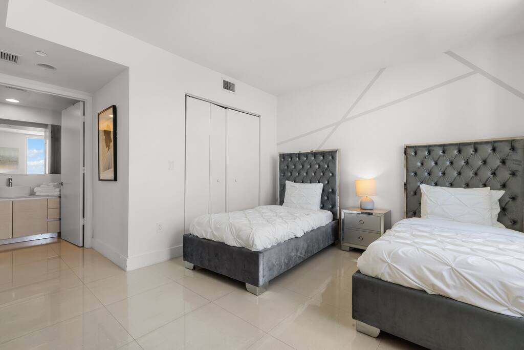 The second bedroom features two comfortable twin-size beds with elegant tufted headboards, a spacious closet, and a flat-screen smart TV for your entertainment. Enjoy the added convenience of a private in-room bathroom, offering both comfort and privacy.