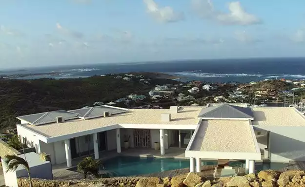 The villa is very unique in its architecture and offers stunning views of the ocean, surrounding hillsides and Orient Bay.