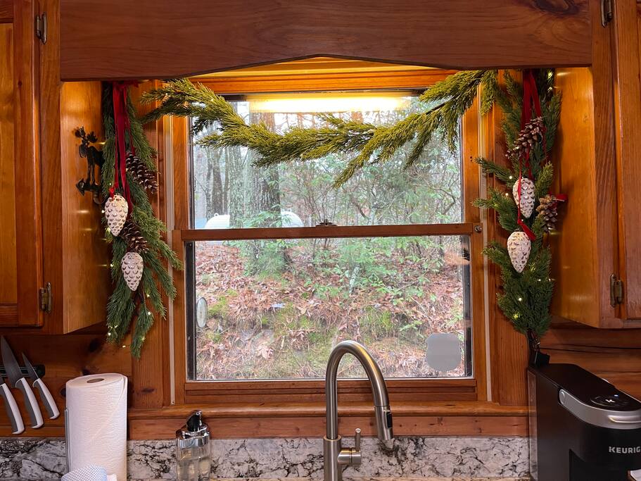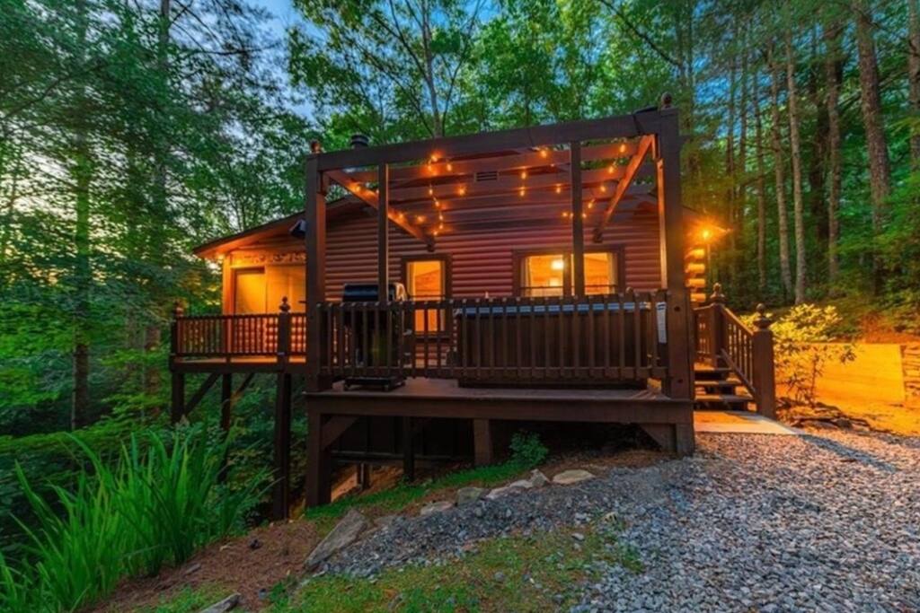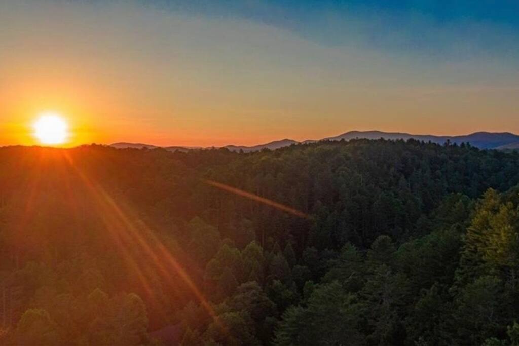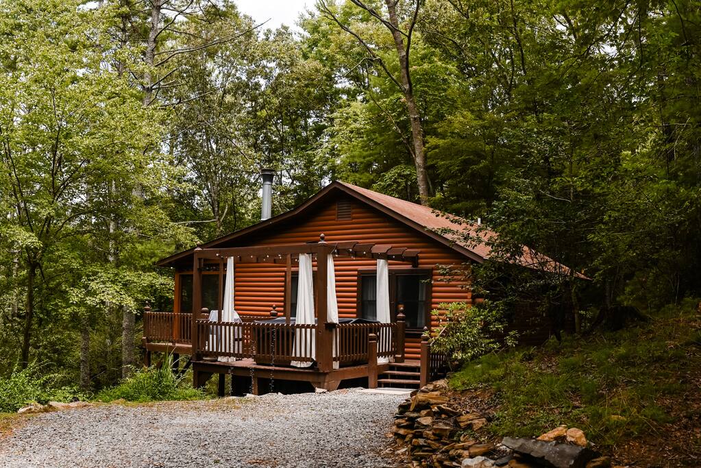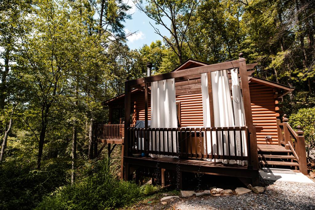 Sunset Peak Cottage is on a wooded, private lot with seasonal partial mountain views and the rush of the Ellijay River in the valley below.