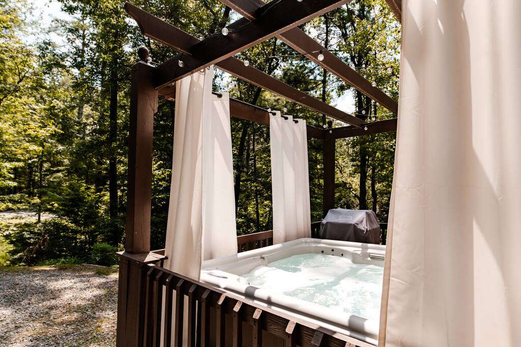 - Arbor-covered deck with hot tub and privacy curtains