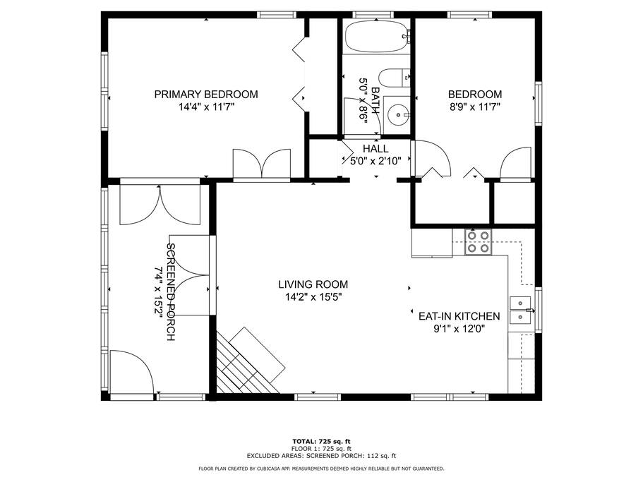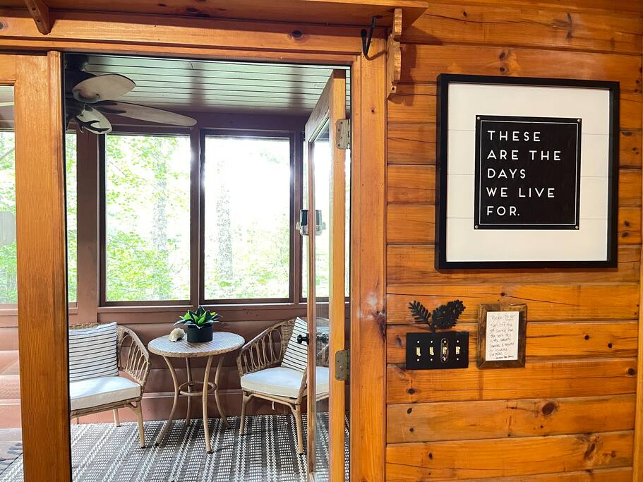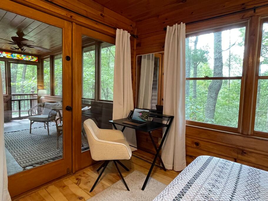 - Bedroom 1: King Bed, Smart Roku TV, Dedicated Work Space, French doors to screened porch