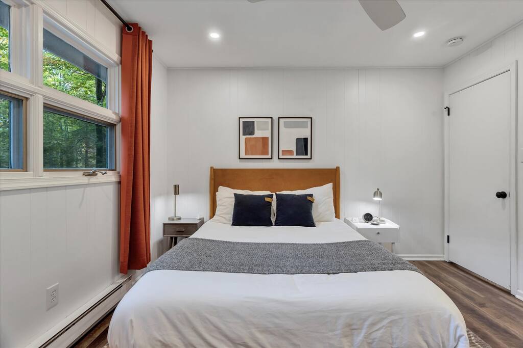 All three bedrooms feature cathedral ceilings, zoned ductless mini-split heating and cooling, ceiling fans, remote-controlled tower fans, personal Sonos speakers, and fast-charging USB ports.