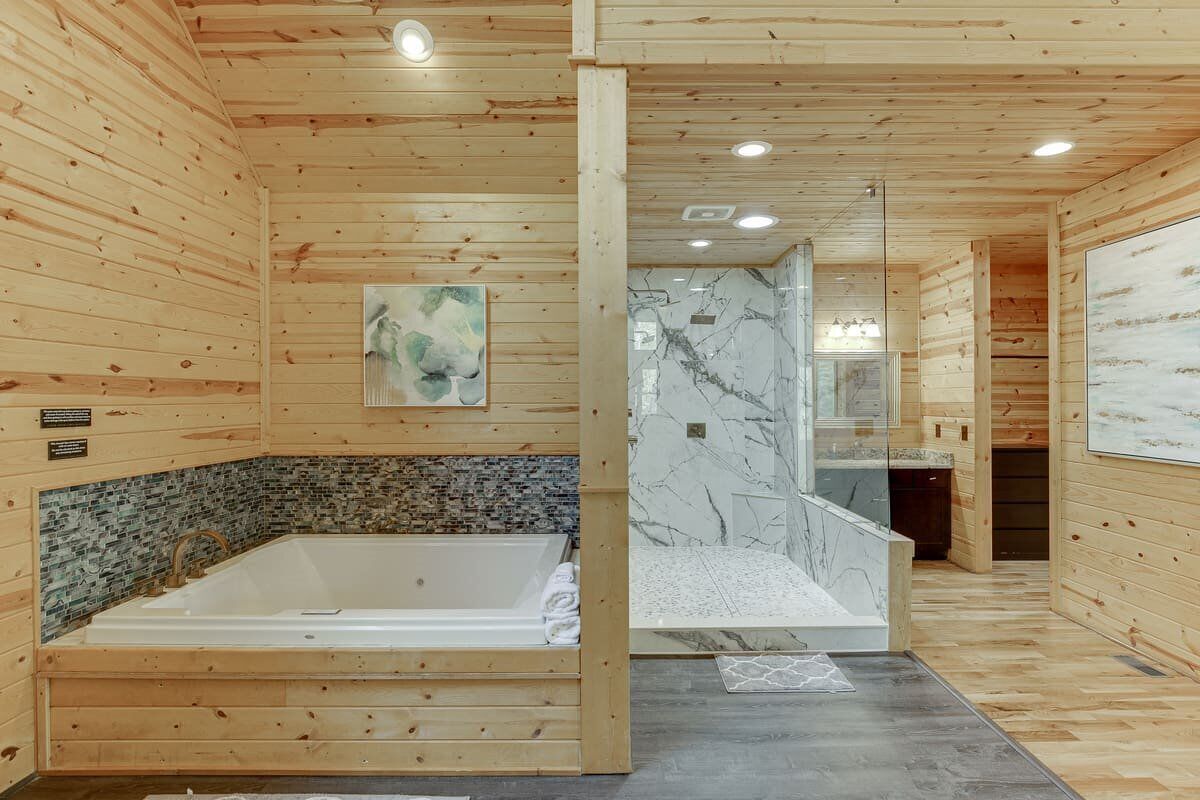 With the inside of the cabin being so relaxing, you may choose not to leave, but you’re still covered; there’s an exclusive natural light tube that brings 100% natural light into the shower and bath area. When you do step outside, the covered back private deck not only has an amazing view of a valley below along with a babbling creek, it’s also the perfect spot to have a quiet meal or beverage.