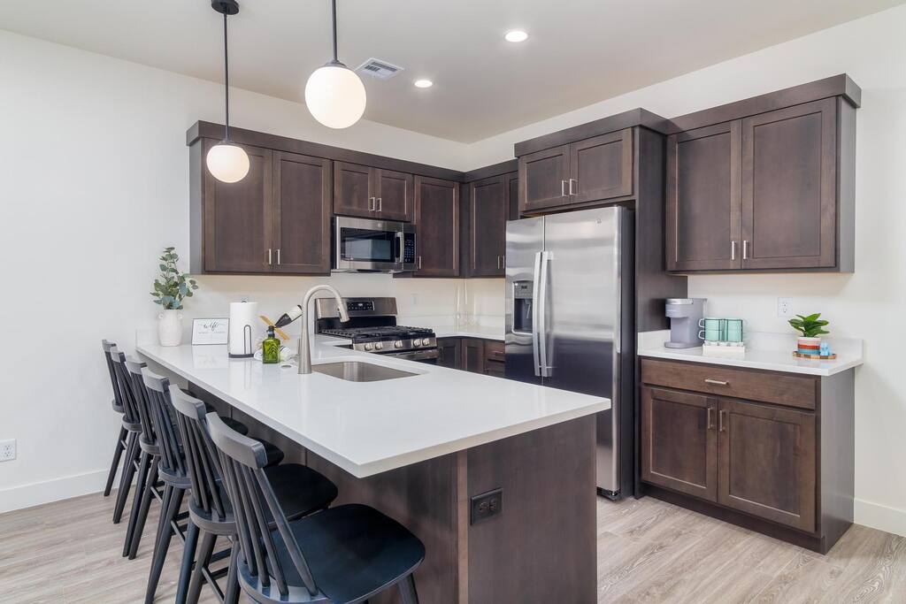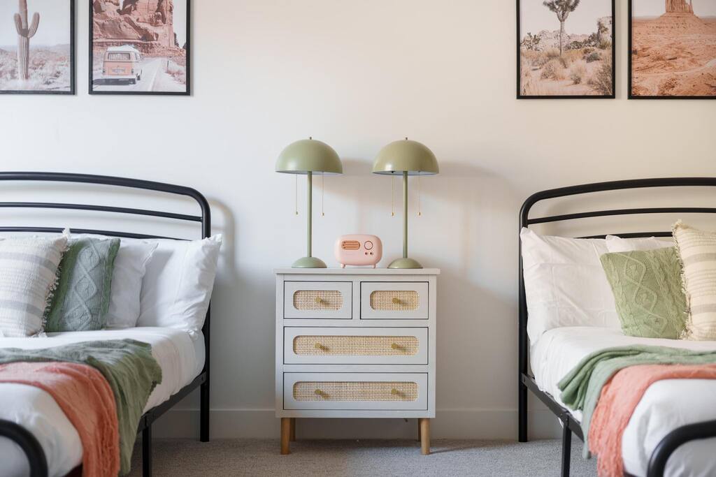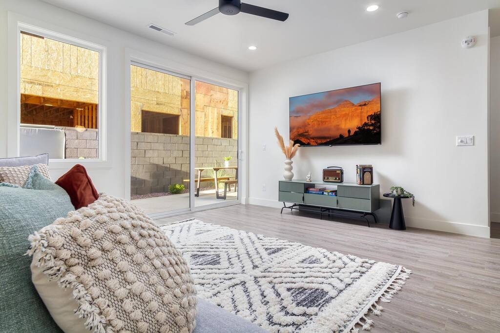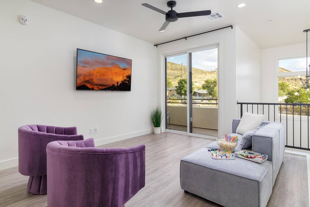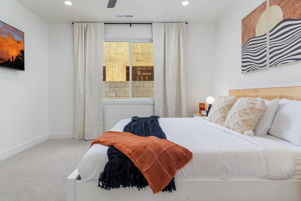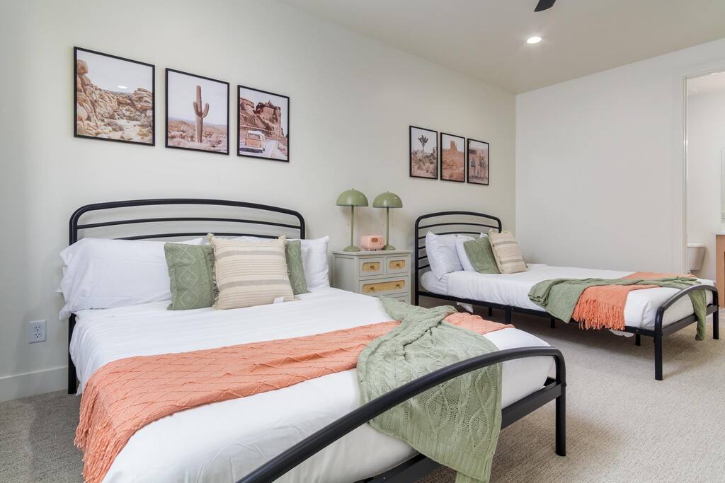 Escape to this modern townhome, just 20 minutes from Zion National Park! Perfect for up to 26 guests, it offers a main-floor king suite and three spacious bedrooms upstairs. The highlight is a cactus-themed bunk room with 3 triple full bunks. There's also a bedroom with two queens and an en suite, plus another king suite. Enjoy a cozy loft for games or movies, and relax in the open living, kitchen, and dining areas. Ideal for large groups or families seeking adventure and a desert retreat!