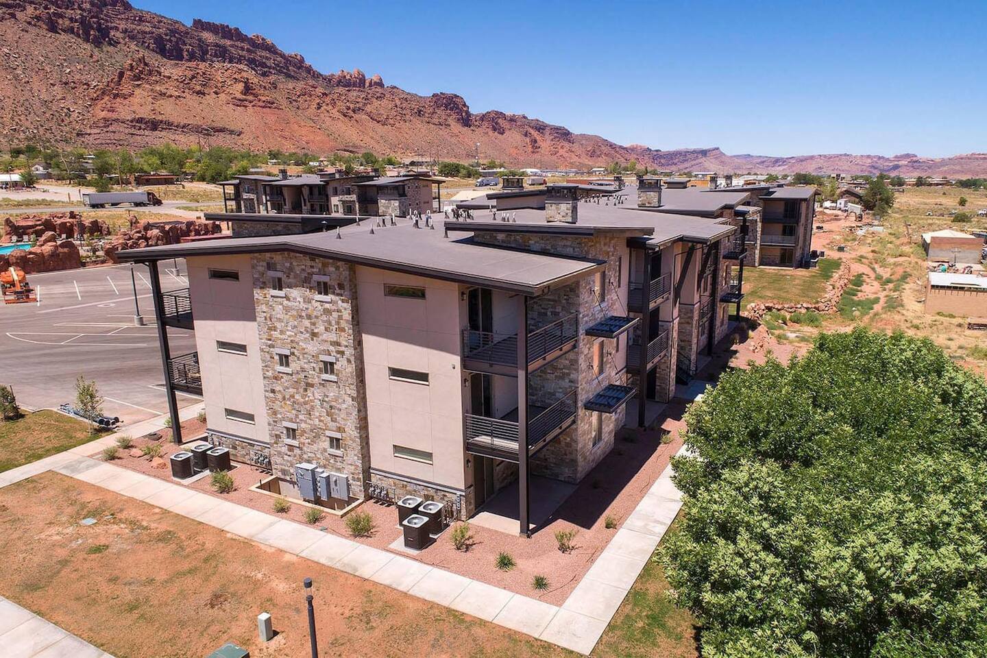 If you're looking to stay in a luxury condo that's only 15 minutes away from Arches National Park and World-Class Rock Crawling Trails, this is it! The Sage Creek resort pools and amenities are indeed a showpiece. They include 2 hot tubs, waterfalls, weeping water walls, 2 pools (including zero entry), multiple secluded fire pits, fire warming kiosks, and a bocce ball courts in the common pool area. Other amazing features include a poolside mezzanine with an outdoor loft BBQ kitchen, a large dining and lounging area surrounding an amazing modern gas fireplace with a Moab Rim backdrop.