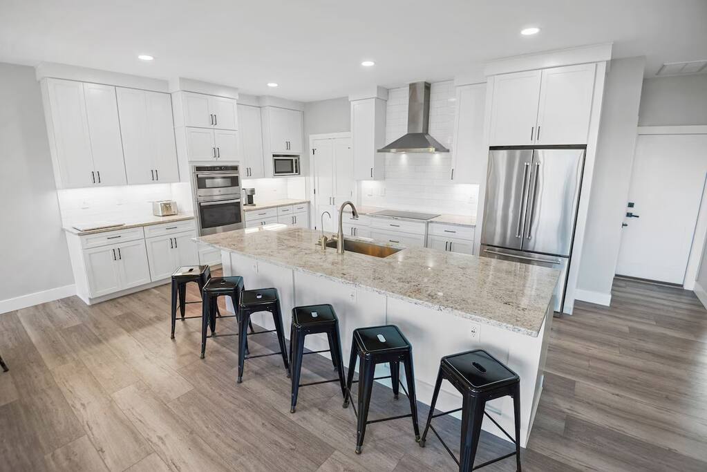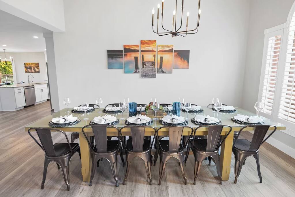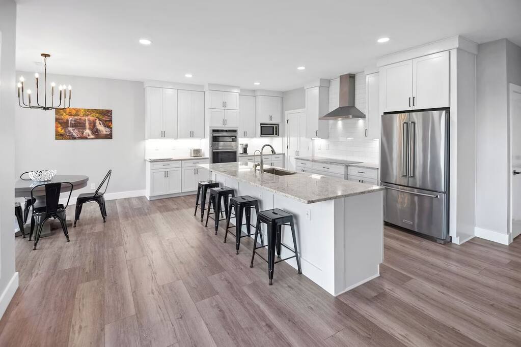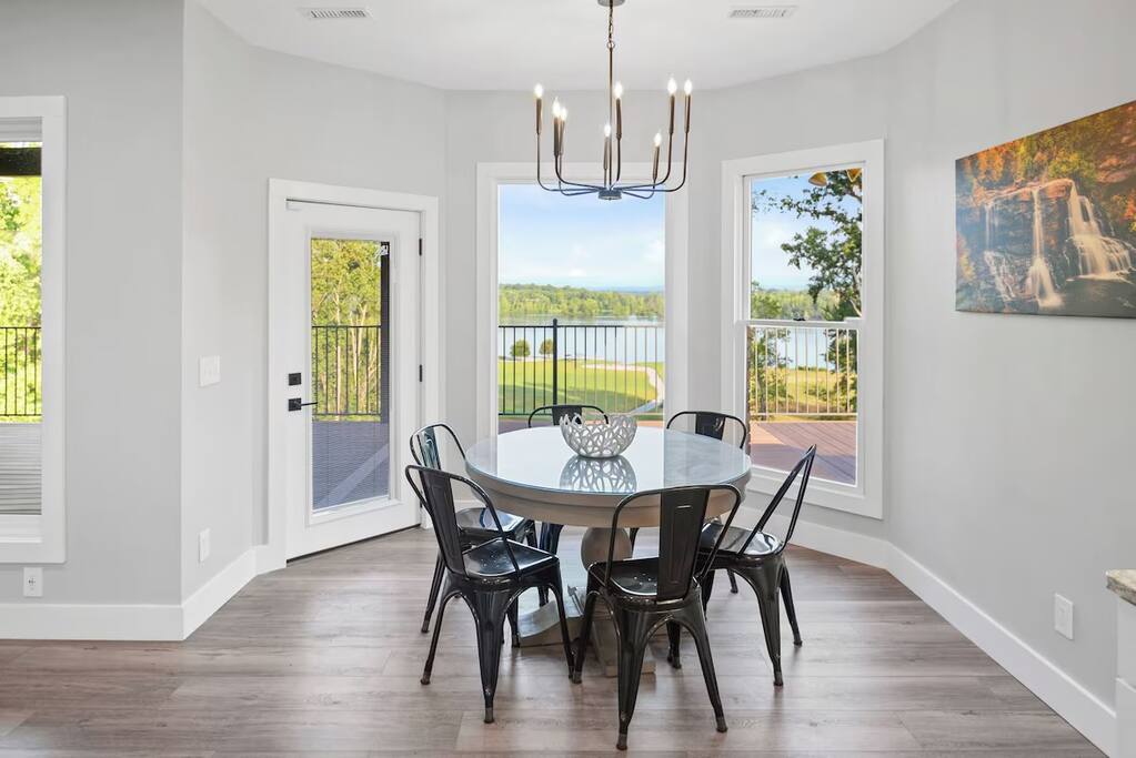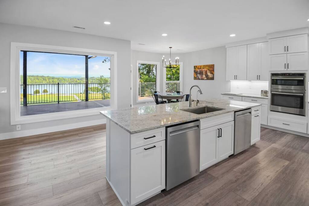 Cook with ease in a chef-style kitchen featuring double ovens, stainless steel appliances, a spacious island, and generous prep space. The open dining area shines with stylish lighting and sweeping lake views—perfect for gathering and sharing meals.