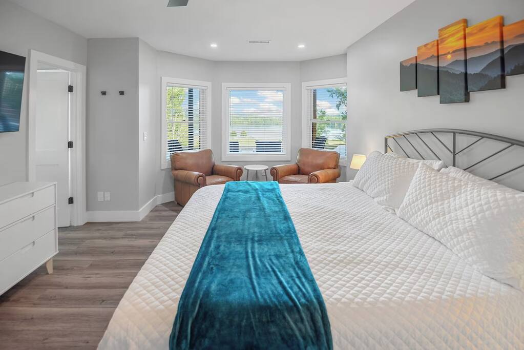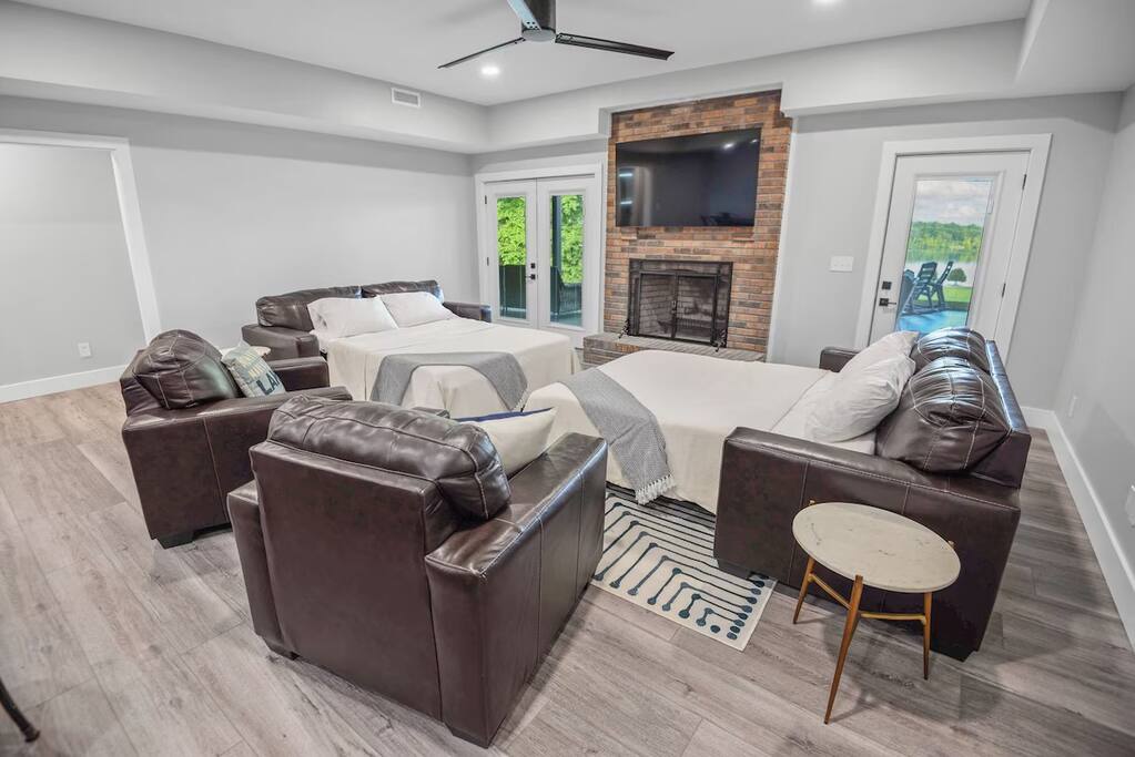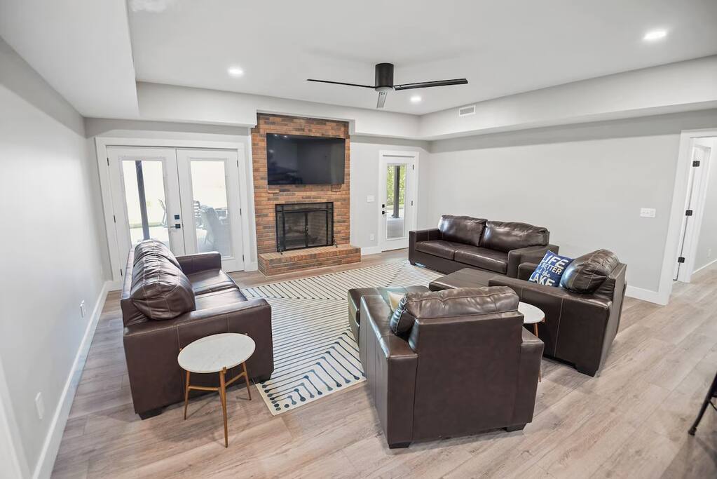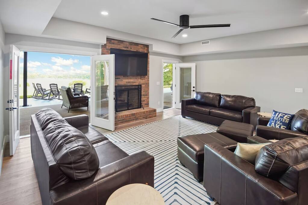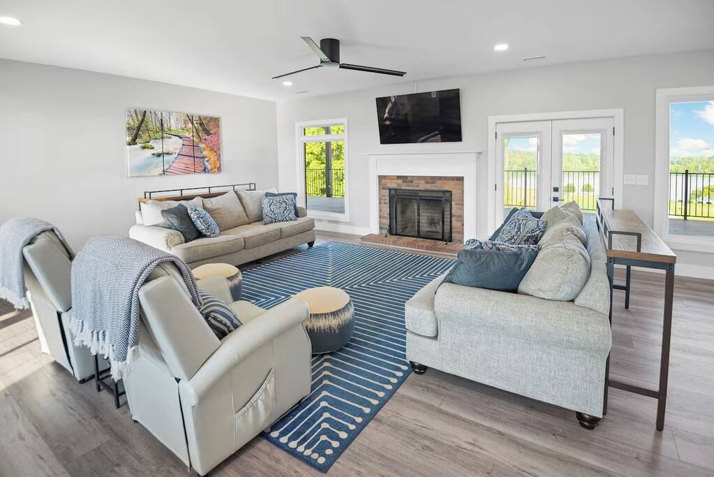 .☛ Living Room1: Bright and open with plush sofas, recliners, fireplace, and Smart TV. Floor-to-ceiling windows and French doors fill the space with light and lake views.