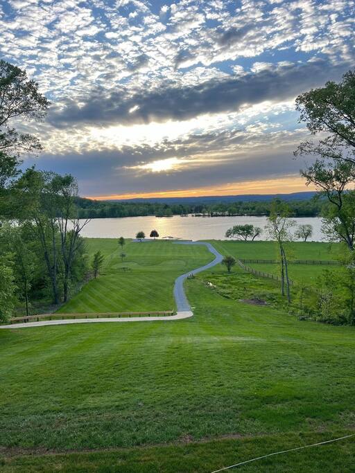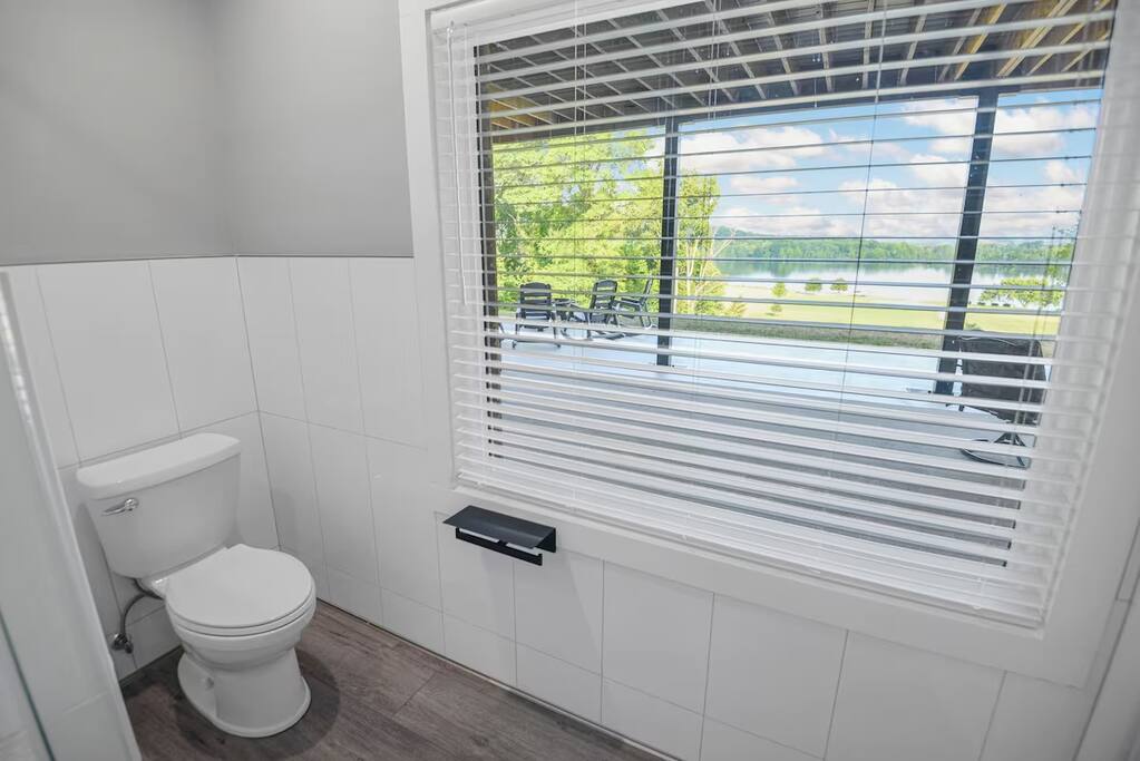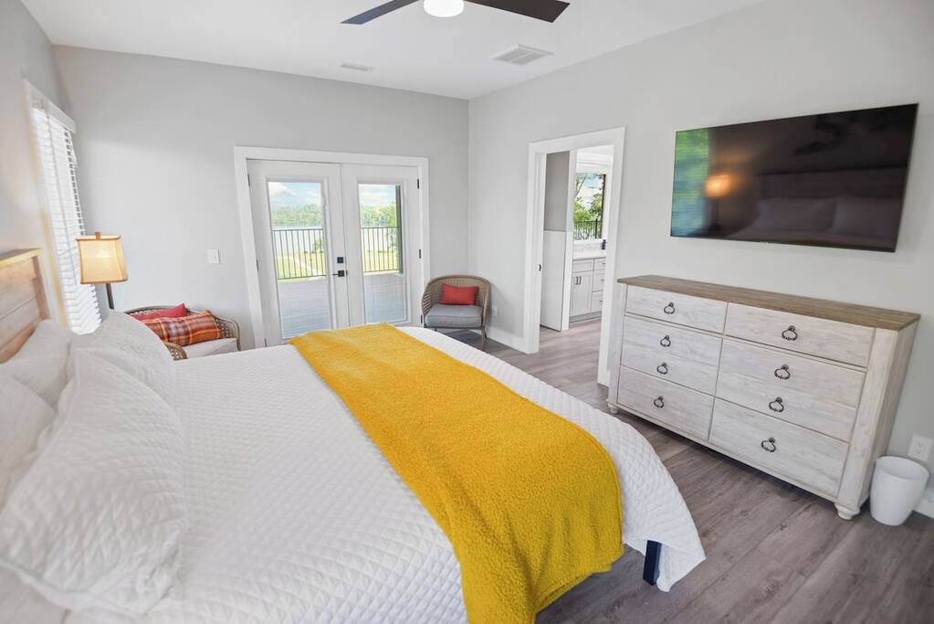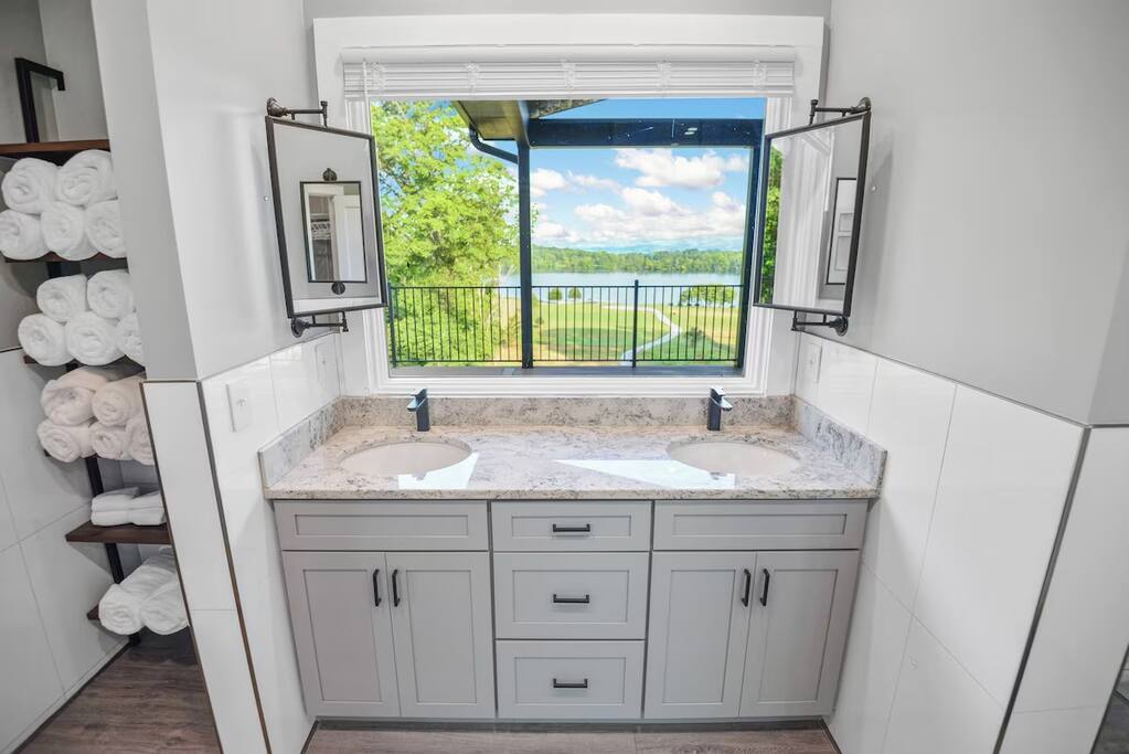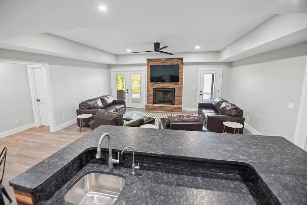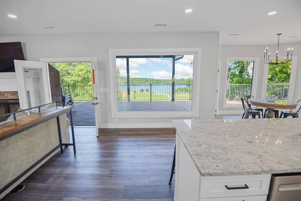 .☛ Living Room1: Bright and open with plush sofas, recliners, fireplace, and Smart TV. Floor-to-ceiling windows and French doors fill the space with light and lake views.