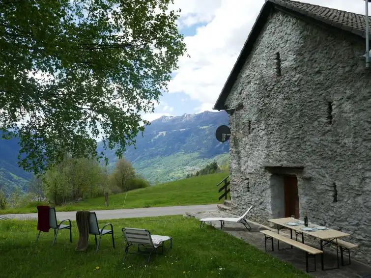 Chislerio 19 km from Malvaglia: Note: Power is supplied by a solar panel. Stove and boiler are gas-operated. Electrical appliances over 250W can not be operated. Cosy, rustic rustic chalet "Casa Sosto", 1'115 m a.s.l., surrounded by meadows. Above Largario, in the district Valle di Blenio, in a sunny position, 100 m from the edge of the forest, in the countryside, south facing position. Private: natural state property. In the house: storage room for bicycles. Motor access (mountain road). (13 steps). Parking at the house. Grocery 4 km, supermarket 8 km, restaurant 4 km, bakery 8 km, café 8 km, bicycle rental 6 km, bus stop "Ponto Valentino Fontana bus 134" 5 km, railway station "Biasca FFS - SBB" 23 km. Riding stable 15 km, walking paths from the house 10 m, cable car 11 km. Nearby attractions: Castelli di Bellinzona (UNESCO), Mercato di Bellinzona (sabato), Chiesa di Negrentino, Museo Blenio, Castello di Serravalle, Archivio Doneta, Cima Norma, Monte Tamaro-Splash and SPA, Rivera. Well-known lakes can easily be reached: Lago Luzzone, Lago Ritom, Lago Maggiore, lago di Lugano. Hiking paths: Nara, Greina, Lucomagno, Val Malvaglia, Valle di Blenio. Please note: car recommended. Animals in the neighbourhood."Sosto", 2-room cottage 60 m2 on 2 levels, south facing position. Partly with sloping ceilings, rustic and cosy furnishings: open living/dining room with 1 bed (90 cm, length 200 cm), open-hearth fireplace, dining table and satellite TV. With sloping ceilings kitchen (oven, Gas stove, 4 gas rings, freezer, fondue Set (cheese)) with wood-burning stove. Shower/WC. Wood heating. Solar power. Upper floor: open mezzanine with sloping ceilings with 1 bed (90 cm, length 200 cm), 1 double bed (2 x 80 cm, length 200 cm). Comfortable furnishings in the country house style. Terrace furniture, barbecue (portable), deck chairs (2). Very beautiful panoramic view of the mountains, the valley and the countryside. Facilities: children's high chair, baby cot for up to 2 year olds (extra). Internet (WiFi, extra). Please note: suitable for families. Non-smoking house. Maximum 2 pets/ dogs allowed. Fire extinguisher. NL-00006645