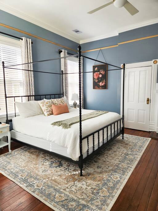 Steps from iconic Forsyth Park, our elegantly renovated 3BR/3BA home blends historic Southern charm with quiet luxury. Relax on the porch rocking chairs or enjoy spacious interiors with modern amenities. Private parking and a fully equipped kitchen make your stay effortless. Easy walk to top restaurants, shops & historic sites.