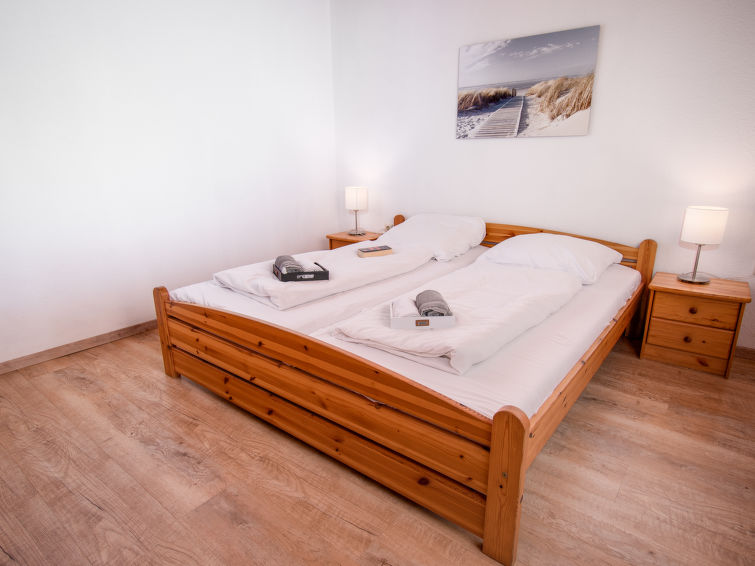 Apartment house. In the centre of Norddeich, 1.2 km from the sea, 1.2 km from the beach. In the house: central heating system. Parking at the house. Supermarket 300 m, restaurant, bakery 350 m, café 700 m, bus stop 250 m, railway station 1.4 km, ferry 1.4 km, sandy beach 1.2 km, outdoor swimming pool 14 km, indoor swimming pool 1 km. Golf course (18 hole) 8 km, surf school 1.2 km, tennis 2 km, minigolf 1 km."Strandkorb", 2-room apartment 43 m2, on the ground floor. Beautiful and tasteful furnishings: living/dining room 13 m2 with 1 double sofabed (160 cm, length 200 cm), cable TV (flat screen), CD-player and DVD. Exit to the terrace. 1 room 13 m2 with 1 double bed (2 x 90 cm, length 200 cm). Kitchenette (oven, 4 ceramic glass hob hotplates, toaster, kettle, microwave, electric coffee machine) with dining table. Bath/shower/WC with corner bath. Terrace 10 m2. Terrace furniture. Facilities: children's high chair (extra). Internet (WiFi, free). Please note: non-smokers only. Smoke alarm.