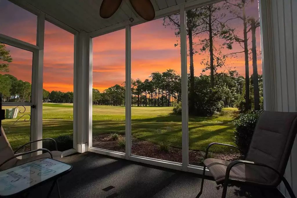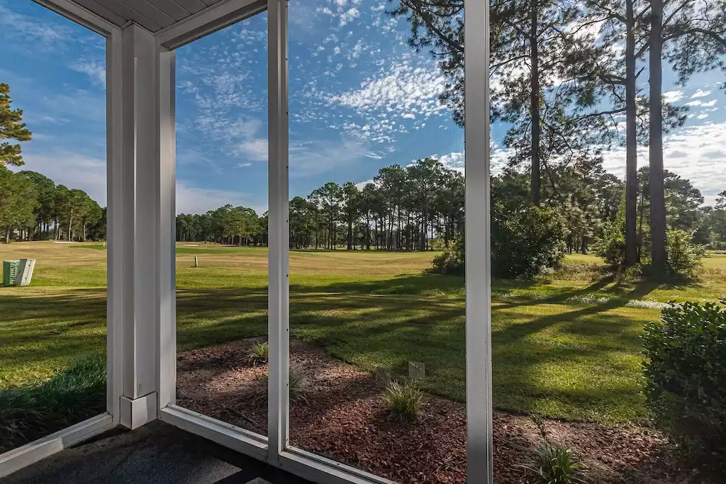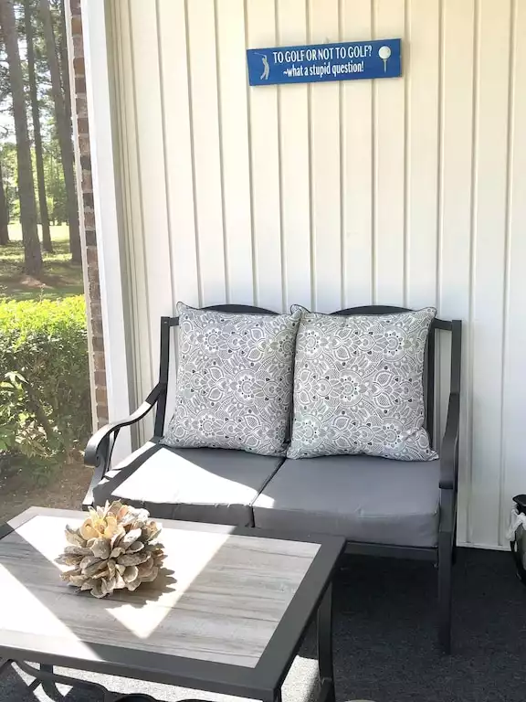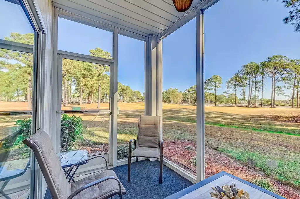 Park directly outside your unit and find the Villa which features a bedroom with king bed, bedding and linens and attached bath. A washer/dryer is in the unit as well. Prepare home-cooked meals in the unit’s bright fully equipped kitchen. The relaxing living room with beach inspired furnishing with an ottoman that folds out to a TWIN. A ROKU stick provides access to YouTube TV on both TV's or log into your account via other APPS loaded on the stick and wi-fi for your other communication needs. Open the slider to the enclosed patio where you can enjoy morning coffee, unwind, read a book or watch golfers tee off from Byrd #10 as well as see their final approach to the green with binoculars provided!