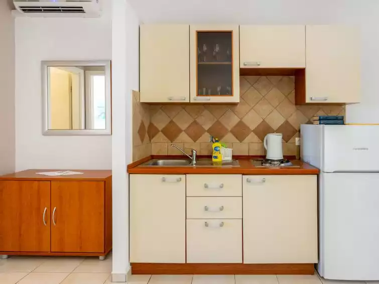 Apartment house "Tino". In the centre of Sukošan 10 km from the centre of Zadar, 200 m from the sea, 200 m from the beach. For shared use: property 200 m2. Outdoor shower, terrace, garden furniture, barbecue. In the house: internet access. Parking on the premises. Supermarket 650 m, bus stop 350 m, pebble beach, concrete beach 200 m.2-room apartment 35 m2, on the upper ground floor. Living/dining room with 1 double sofabed (155 cm, length 200 cm), satellite TV (flat screen), air conditioning. 1 room with 1 french bed (160 cm, length 200 cm). Open kitchen (2 hot plates, toaster, kettle, electric coffee machine). Shower/WC. No heating option. Terrace roofed. Terrace furniture. Facilities: Internet (WiFi, free). Parking (1 car).