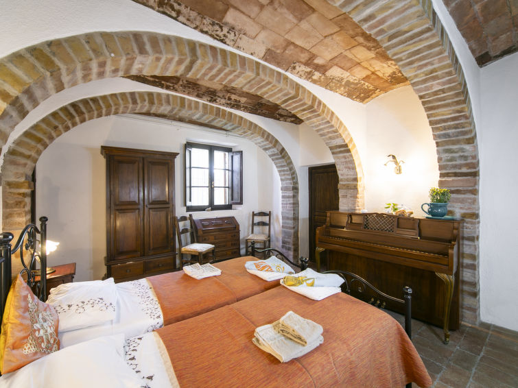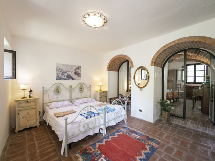 The house we propose, located in a panoramic position, is divided into two apartments communicating with each other from the outside. Large, child friendly, comfortable country house "Vedi Torre", from the 18th century, renovated in 2004, surrounded by trees and fields. 14 km from the centre of San Gimignano, 35 km from the centre of Siena, 48 km from the centre of Firenze, in the district Casaglia, in a secluded, quiet, sunny position on top of a hill, in the countryside. Private: property 1'200 m2, park 150 m2, garden 200 m2, swimming pool (12 x 6 m, depth 140 - 200 cm, seasonal availability: 27.Apr. - 26.Oct.). Outdoor shower, garden furniture, barbecue, pool maintenance by the owner/gardener. In the house: central heating system, heating to be paid on the spot, heating available only from 01.Nov. - 15.Apr.. Motor access to the house (2 km via unmade road). Parking on the premises. Supermarket 3 km, restaurant 3.5 km, bus stop 3 km, railway station 4 km. Golf course (9 hole) 10 km. Nearby attractions: Colle Val d'Elsa 12 km, Castellina in Chianti 21 km, San Donato in Poggio 23 km, Monteriggioni 26 km, Volterra 37 km, Radda in Chianti 40 km. Please note: motorway 5 km from the property. Main road 2 km from the property.6-room house 260 m2 on 2 levels, on the ground floor. Comfortable and antique furnishings: 1 room with 2 beds. Exit to the garden. Walk-through room with 2 beds. Kitchen (4 hot plates, oven) with dining table. Shower/WC, hydro massage shower. Upper floor: entrance hall. Open living/dining room with open-hearth fireplace, dining table, satellite TV, video, CD-player, hi-fi system and DVD. 1 room with 2 beds and shower. 1 room with 2 beds. 1 double bedroom. Kitchen (4 hot plates, oven, dishwasher, microwave, freezer). Bathroom, shower/WC, sep. WC. Terrace 150 m2, patio 200 m2. Terrace furniture, deck chairs (8). Very beautiful, of the countryside. Facilities: washing machine, iron, children's high chair, baby cot for up to 2 year olds, hair dryer. Internet (WiFi, free). Please note: suitable for families. Maximum 1 pet/ dog allowed. Smoke alarm, fire extinguisher. No internal connecting door between the separated properties. IT052028C2J2I66HAX