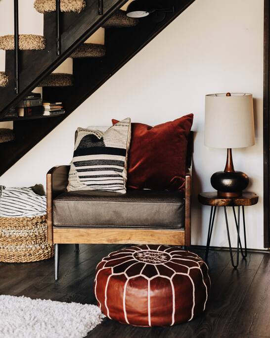 Relax in a warm and inviting gambrel style cozy cabin. Choose from one of the many seating options: the large oversized leather sofa, two comfy lounge chairs or floor pillows and puffs if you prefer the floor. The large sliding door and window bring the outdoors inside, you'll feel like you are amongst the trees. You can grab a book and relax in the reading nook, or play one of our many social games we keep at the cabin. A favorite option is to lounge on the sofa and listen to music on a vintage vinyl record player or you can choose to watch a movie on our Smart TV (Chromecast or AirPlay from your accounts on Netflix, Disney+, Hulu, Amazon Prime, YouTube and much more). We also keep some whiskey on the bar located next to the fireplace – so if you see some and you are feeling it please help yourself.