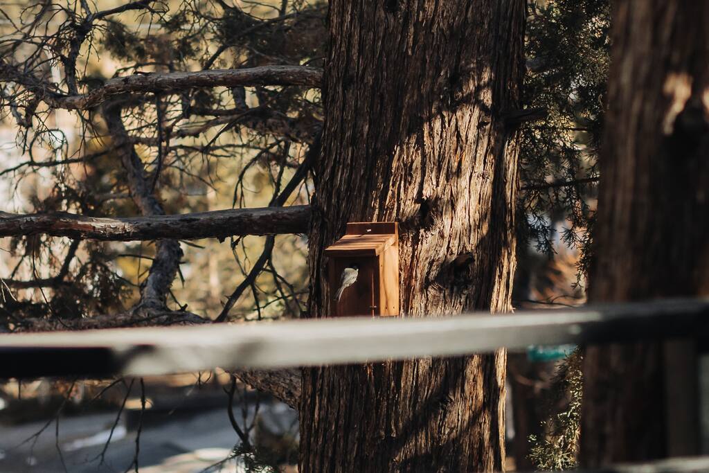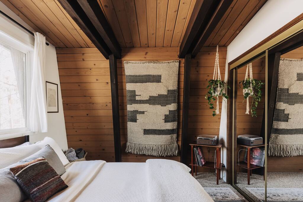 The main bedroom is furnished with a king bed, and a vinyl record player. The secondary bedroom offers a queen bed and a beautiful view overlooking the backyard forest.
