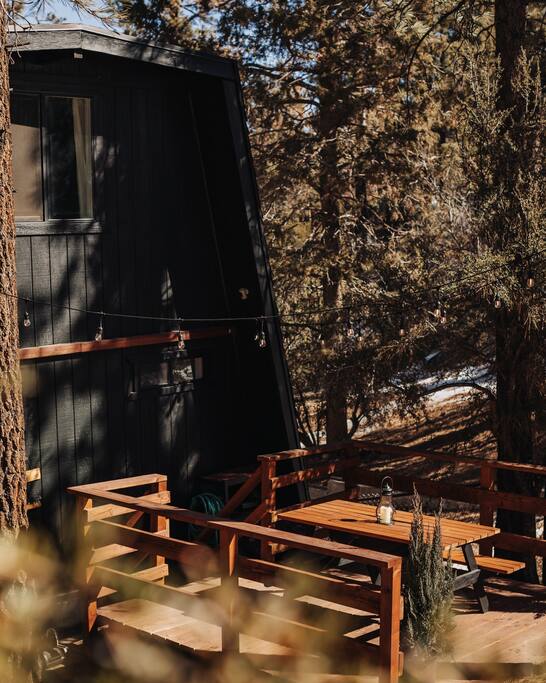 Save ❤️ us to your Wishlists. 𝗪𝗵𝗶𝘀𝗸𝗲𝘆 𝗗𝗲𝗻 𝗕𝗶𝗴 𝗕𝗲𝗮𝗿 is a unique and one of a kind little black cabin with a wrap around deck; situated among the trees. Great for a romantic retreat or relaxing getaway. Relax outdoors in a peaceful mountain setting with a beautifully lit cozy deck area, or walk up to our elevated hot tub area in the backyard. Indoors you will find a wood burning fireplace, coffee bar, board games, a Smart TV, hi-speed internet, and heating. [896 sq ft cozy cabin]