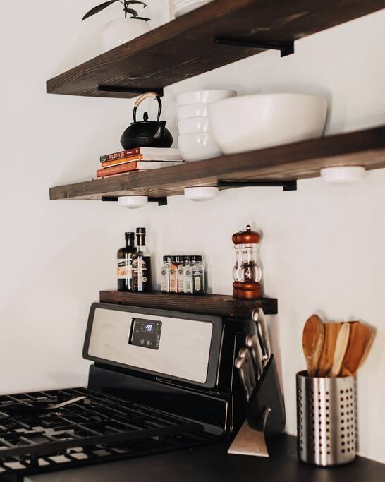 The cabinets and open shelves are stocked with plates, bowls, coffee cups, wine glasses and beer mugs. A gourmet selection of salts and cooking spices from around the world that we can’t wait for you to experience!