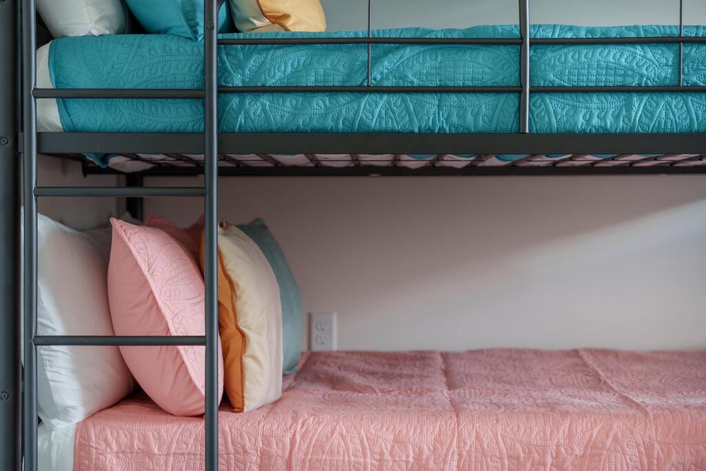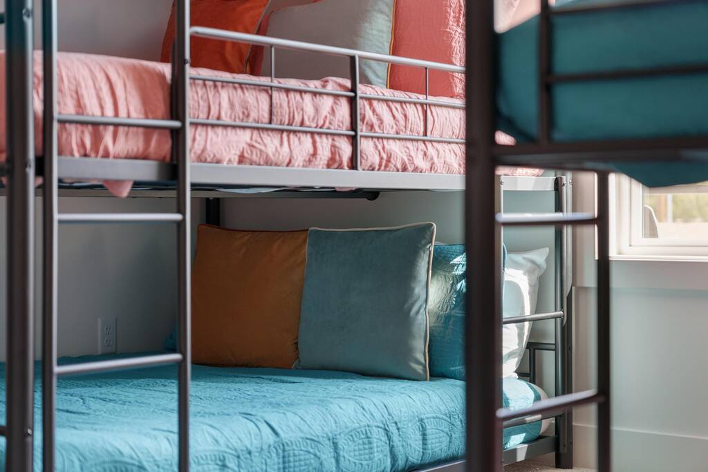 - Bunk Room: With three triple bunks, each featuring full-sized beds, this room comfortably sleeps up to 18 guests. Perfect for large groups or kids. The bunk room also includes a closet with a washer and dryer for added convenience. A full bathroom with a tub is located right across the hall.