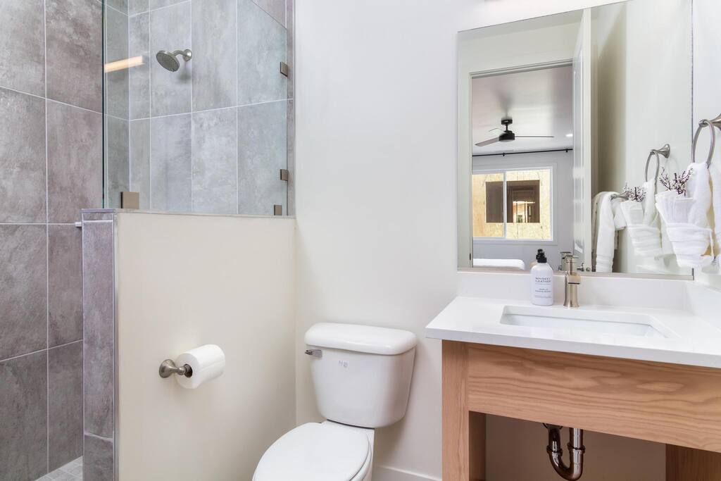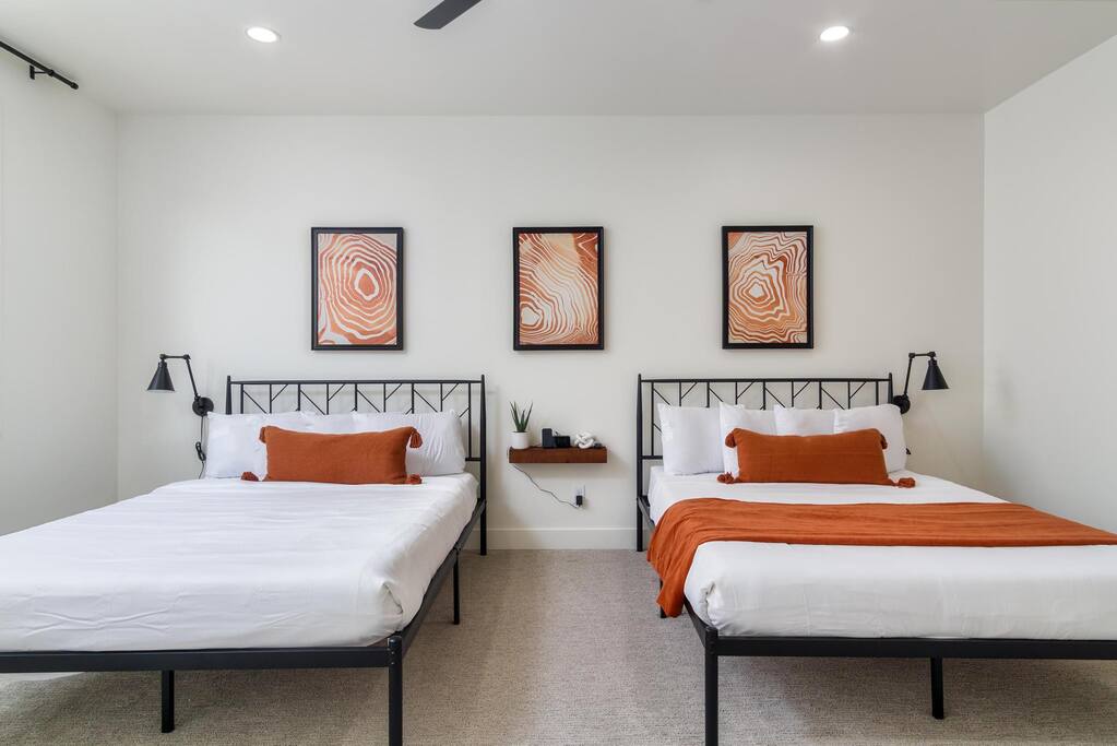- Queen Bedroom: This spacious bedroom includes two queen-sized beds and a private bathroom with a walk-in shower.